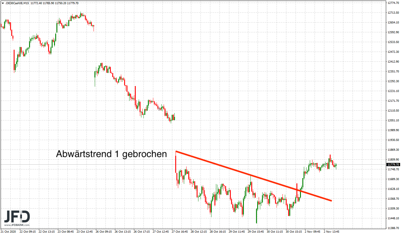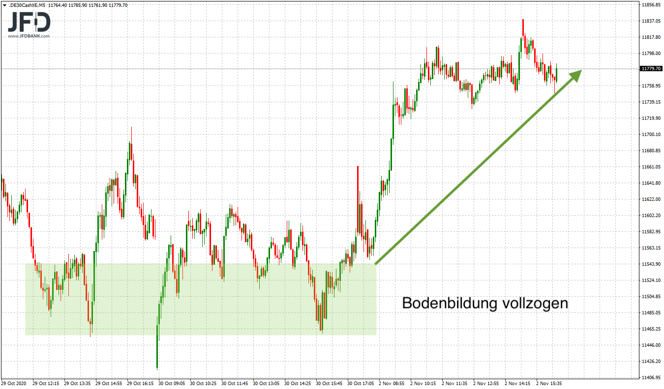 Damit war der bullishe Tag, welcher mit positiven China-Daten begann und am Ende von der Wahlkampf-Euphorie in den USA endete sehr positiv aus und hatte die Tiefs vom Donnerstag / Freitag als Bodenbildung genutzt:
