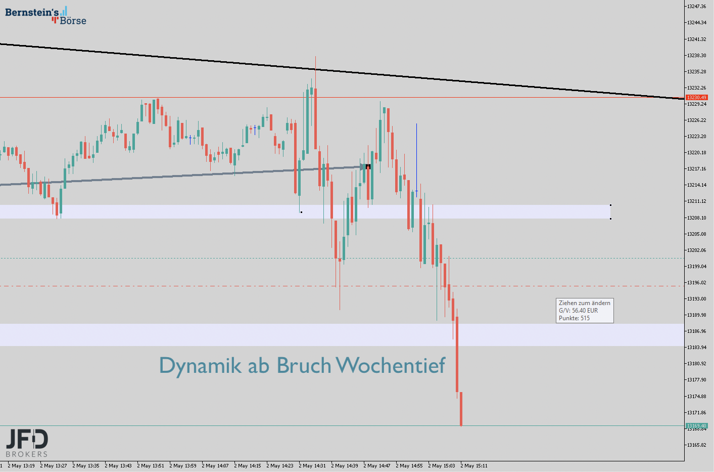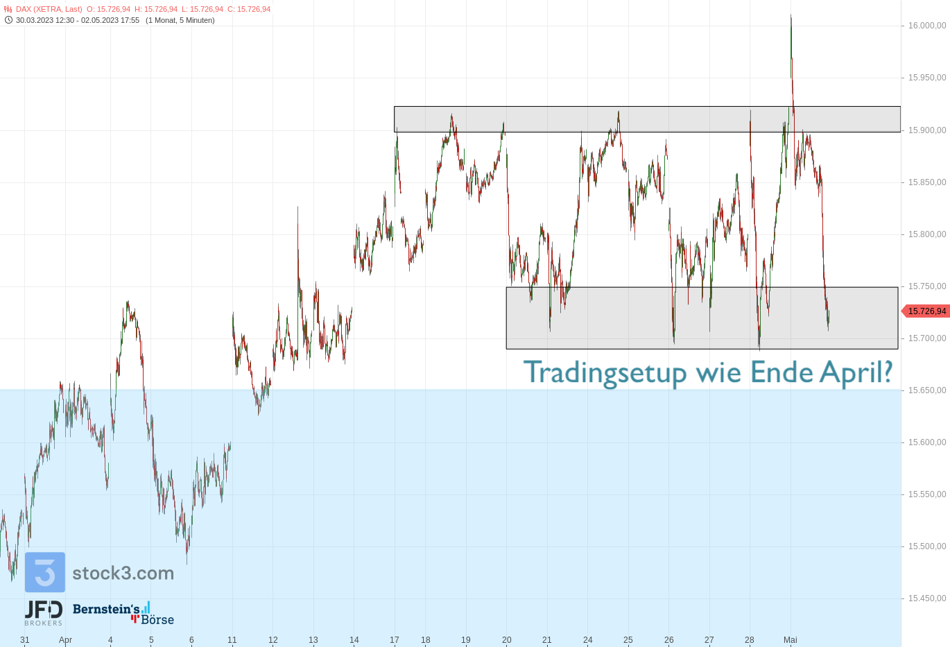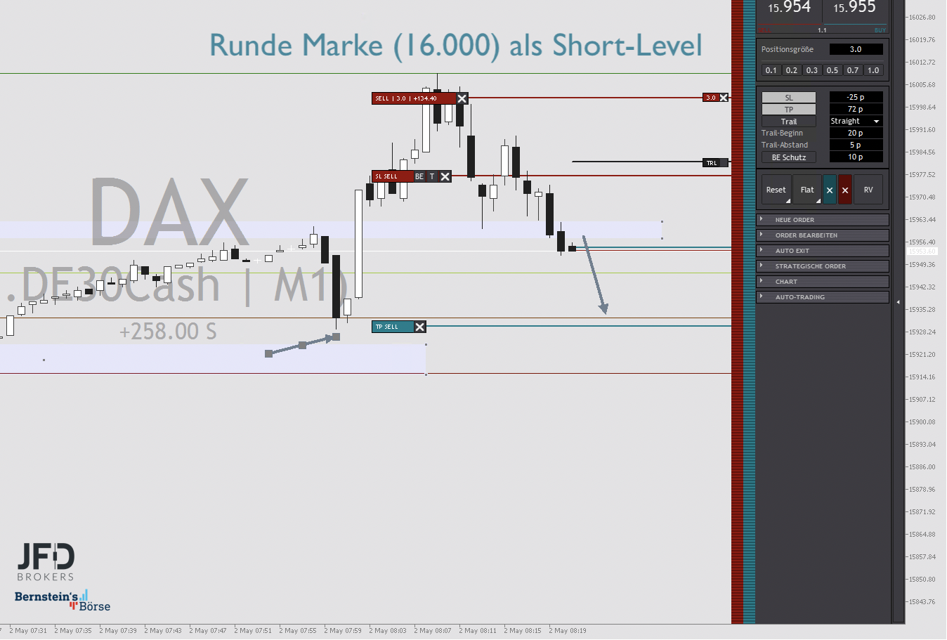 Es kam zu einer dynamischen Bewegung zur runden Marke von 16.000 Punkten, die kurz erreicht und als Tradingsetup für einen Abprall zur Shortseite hin genutzt werden konnte: