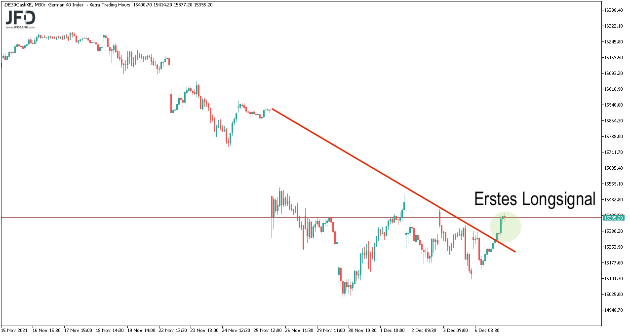 Die Erholung am Montagnachmittag brachte das erste valide Longsignal im Index seit mehr als einer Woche mit sich. Es basierte auf einem Trendbruch, der sich wie folgt darstellte (Rückblick):