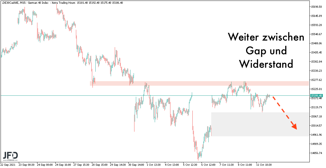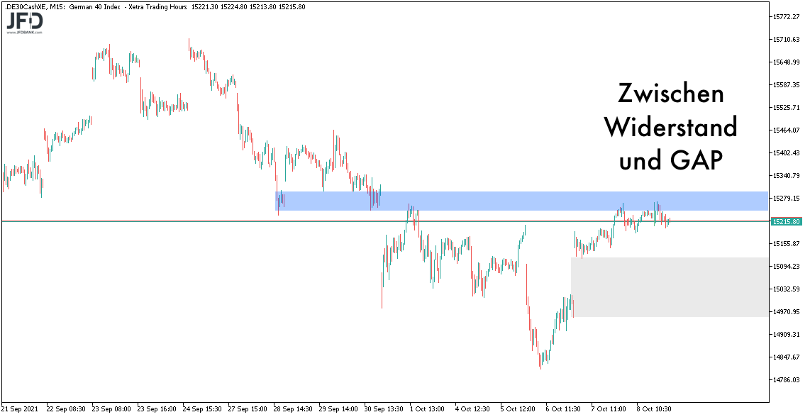 In diesem Chart habe ich gelb das Niveau eingezeichnet, an dem wir uns gestern vornehmlich im Tief aufhielten. Es könnte zunächst der Widerstandsbereich am Morgen sein und von dort aus bis zur 15.199 dann das neue Gap zu gestern aufspannen.