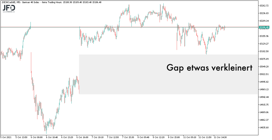 Zunächst versuchte sich der DAX daher noch einmal am frühen Nachmittag an der Unterseite, drang kurz in das Gap ein aber orientierte sich zum Handelsende dann wieder an der Oberseite. Dabei wurde der Freitagsschluss um 4 Punkte verfehlt und der Handelstag damit fast unverändert beendet. Die Bandbreite vom Freitag wurde somit bestätigt: