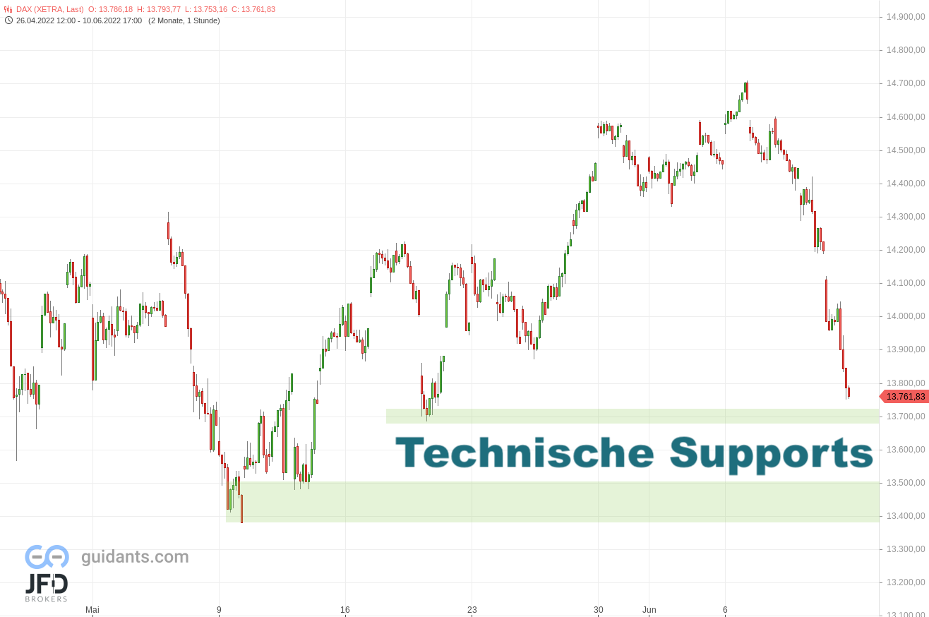 Durch die Nachwirkungen der US-Daten auf die asiatischen Märkte hat es den Future heute Morgen auch noch einmal weiter nach unten gedrückt. Wir stehen nun am zweiten technischen Support aus der Grafik bei 13.500 Punkten: