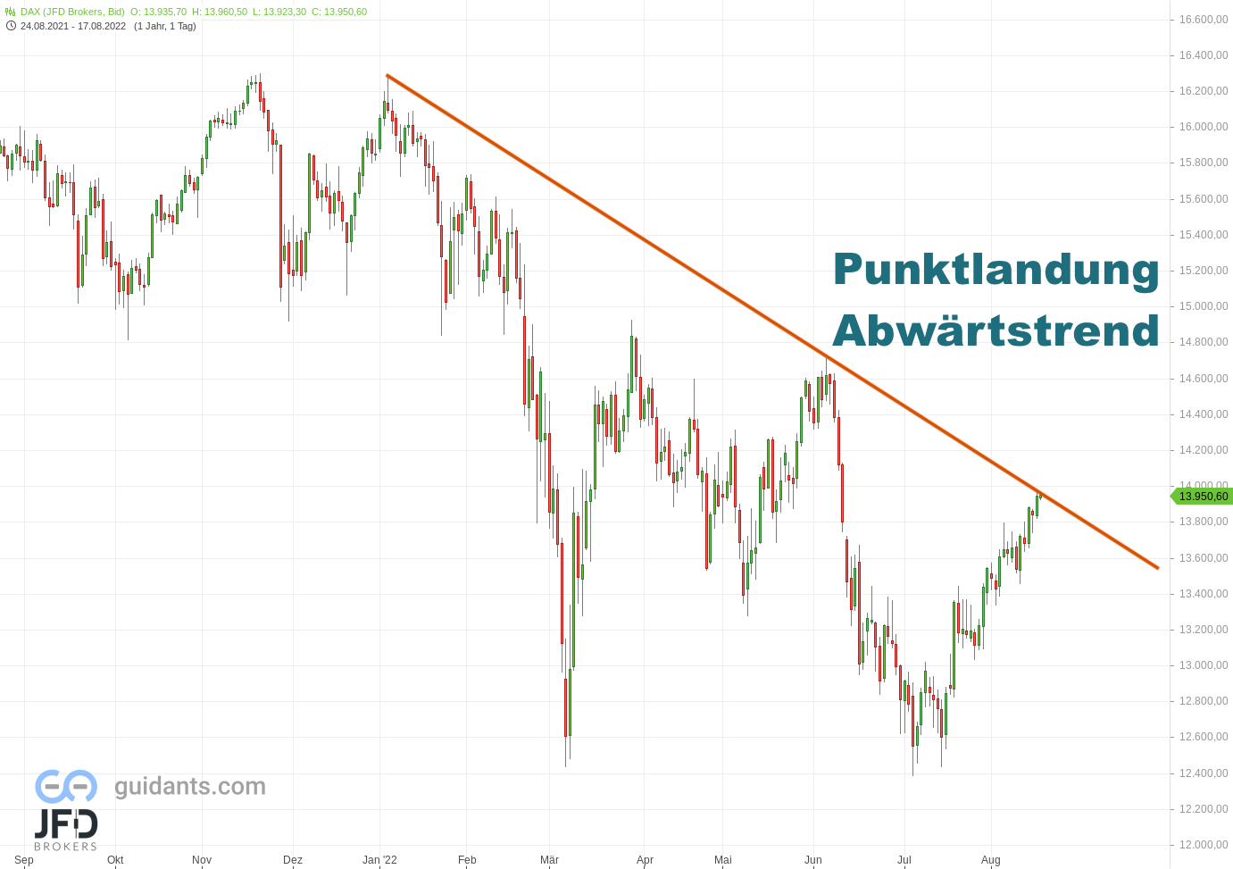 Mit dem Bruch der 13.800 verstärkte sich die Dynamik noch einmal und nahm mit der negativen Eröffnung an den USA-Börsen weiter zu. Wir fielen zügig unter 13.700 Punkte und kamen erst weitaus tiefer, zum XETRA-Ende hin zum Stillstand. Ein Trend wie aus dem Bilderbuch, kann man objektiv resümieren: