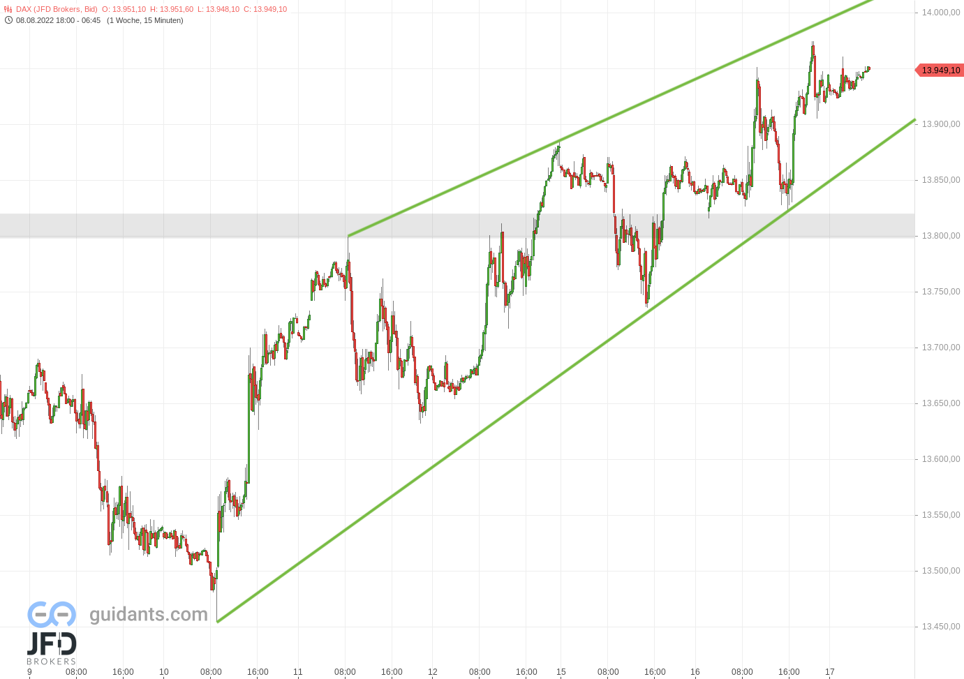 Zusammenfassend achte ich daher auf das Verhalten an der 13.600. Bei Dynamik zur Unterseite ist mein Ziel dann die 13.540 und ggf. auch direkt das Tief vom vergangenen Mittwoch, als die Inflationsdaten aus den USA uns erreichten. Denn hier ist der Auflagepunkt der Trendlinie zu finden und die Marke gilt als "markantes" Tief der letzten Woche.