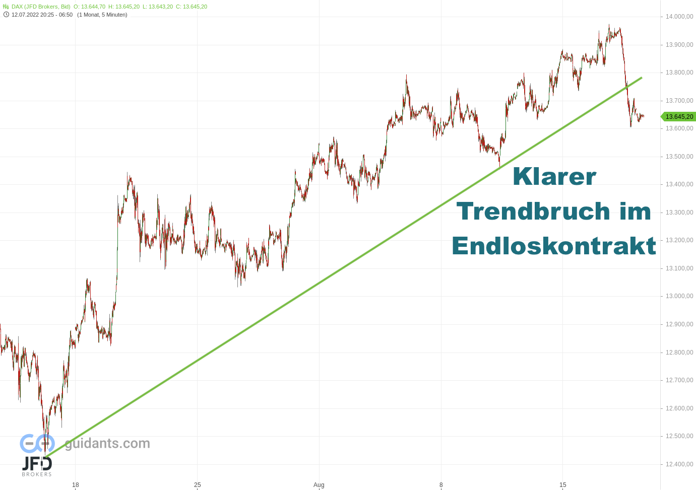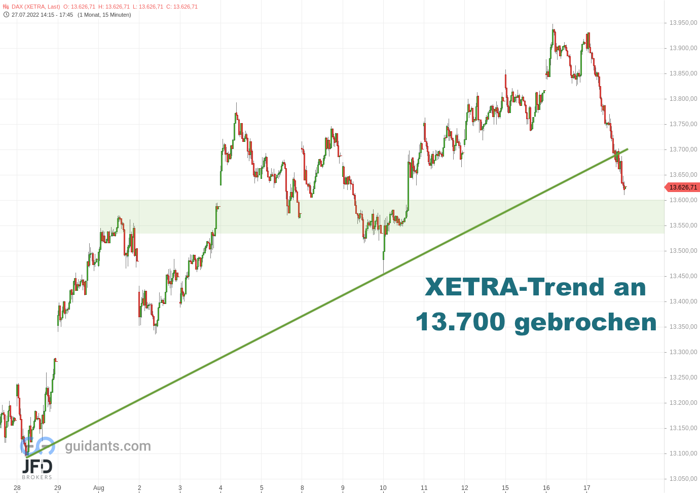 Der Aufwärtstrendkanal vom Start der Analyse ist kaputt. Hier gab es direkt im XETRA-Markt mit dem Unterschreiten der 13.700 einen Trendbruch und damit auch die Fortsetzung des Abwärtsimpulses: