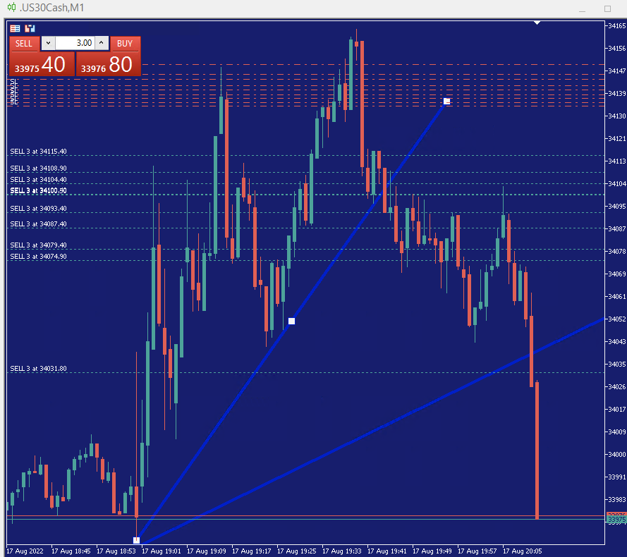 Am Abend gab es zunächst eine starke Erholung, als das US-Notenbank-Protokoll veröffentlicht wurde. Der Dow Jones schaffte ein Gap-close, fiel ab da jedoch wieder zurück auf den Punkt, der 20.00 Uhr zum Protokoll im Chartbild sichtbar war. Genau dieses Szenario nach dem GAP-close hatte ich noch gehandelt und bei Discord kommentiert: