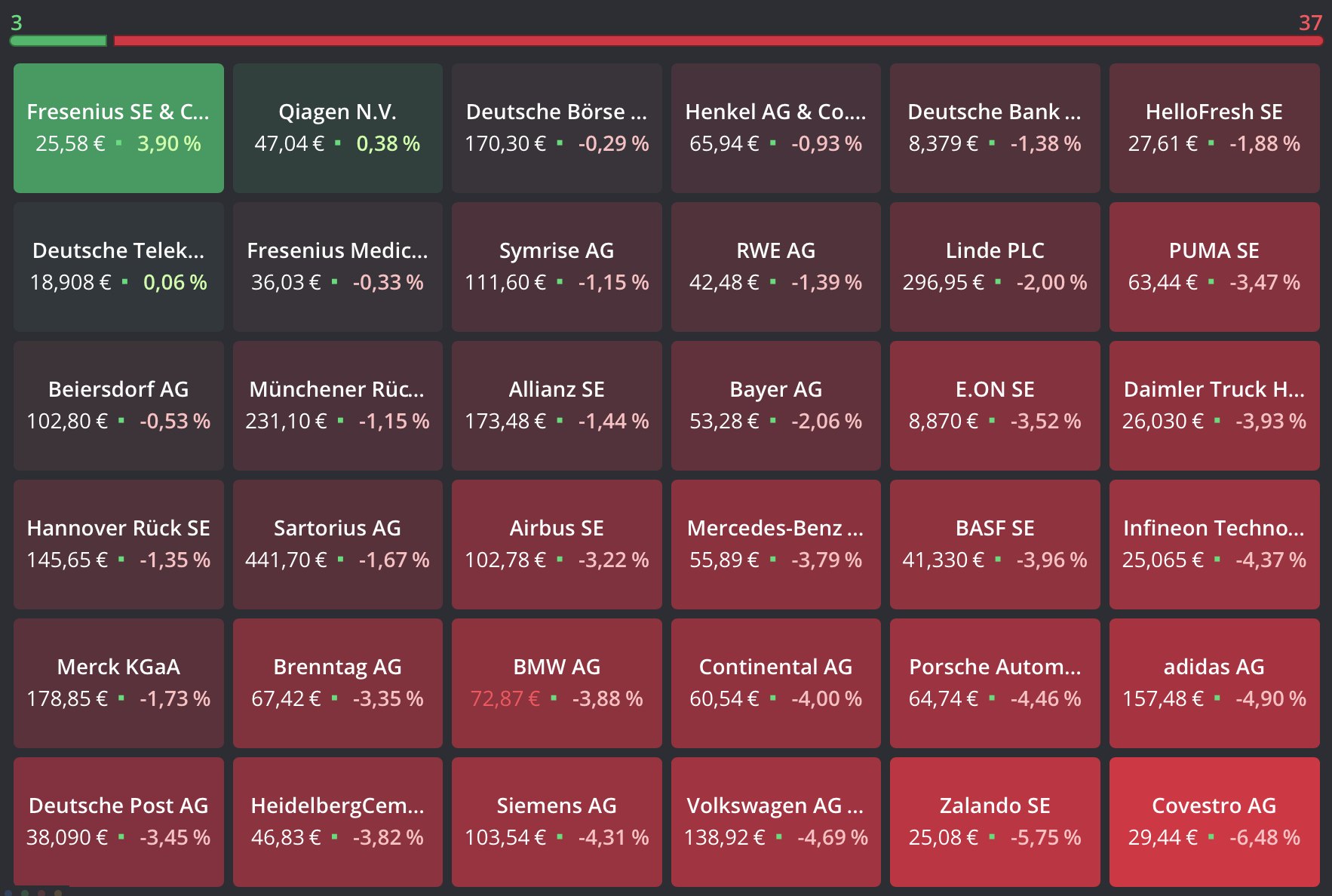 Nur 3 Werte schaffte einen Kursgewinn im DAX. Dazu zählte erneut an der Spitze die Fresenius: