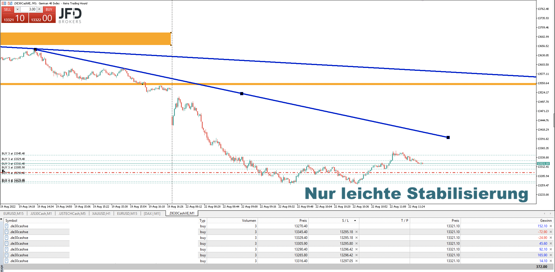 Vom Trading her hatte ich in diesem Bereich auf eine Gegenbewegung gesetzt, konnte die Positionen auch ausbauen, aber dann nicht die ganze Pyramide in den Gewinn bringen: