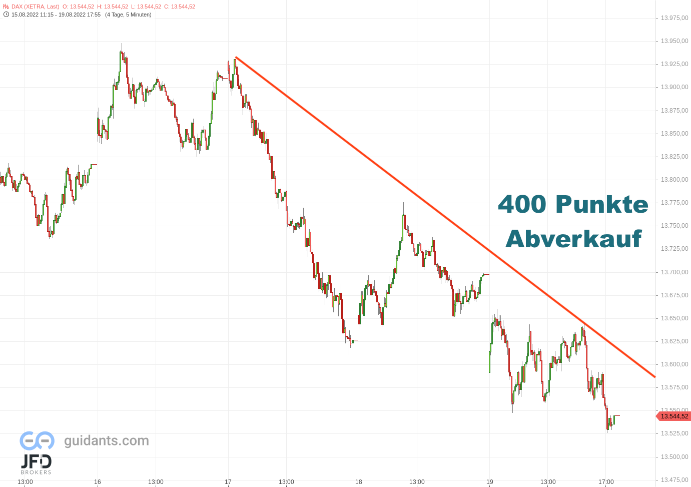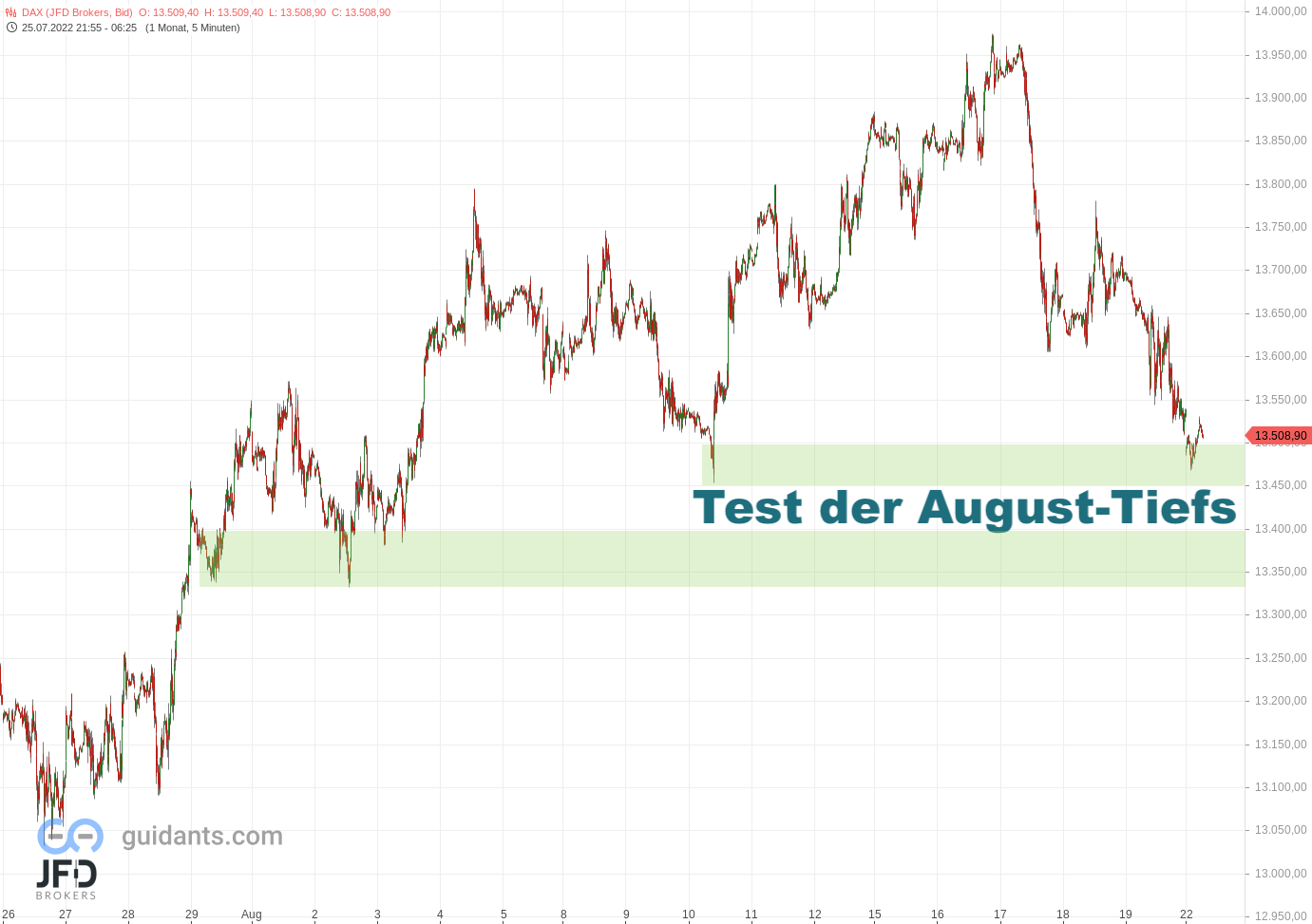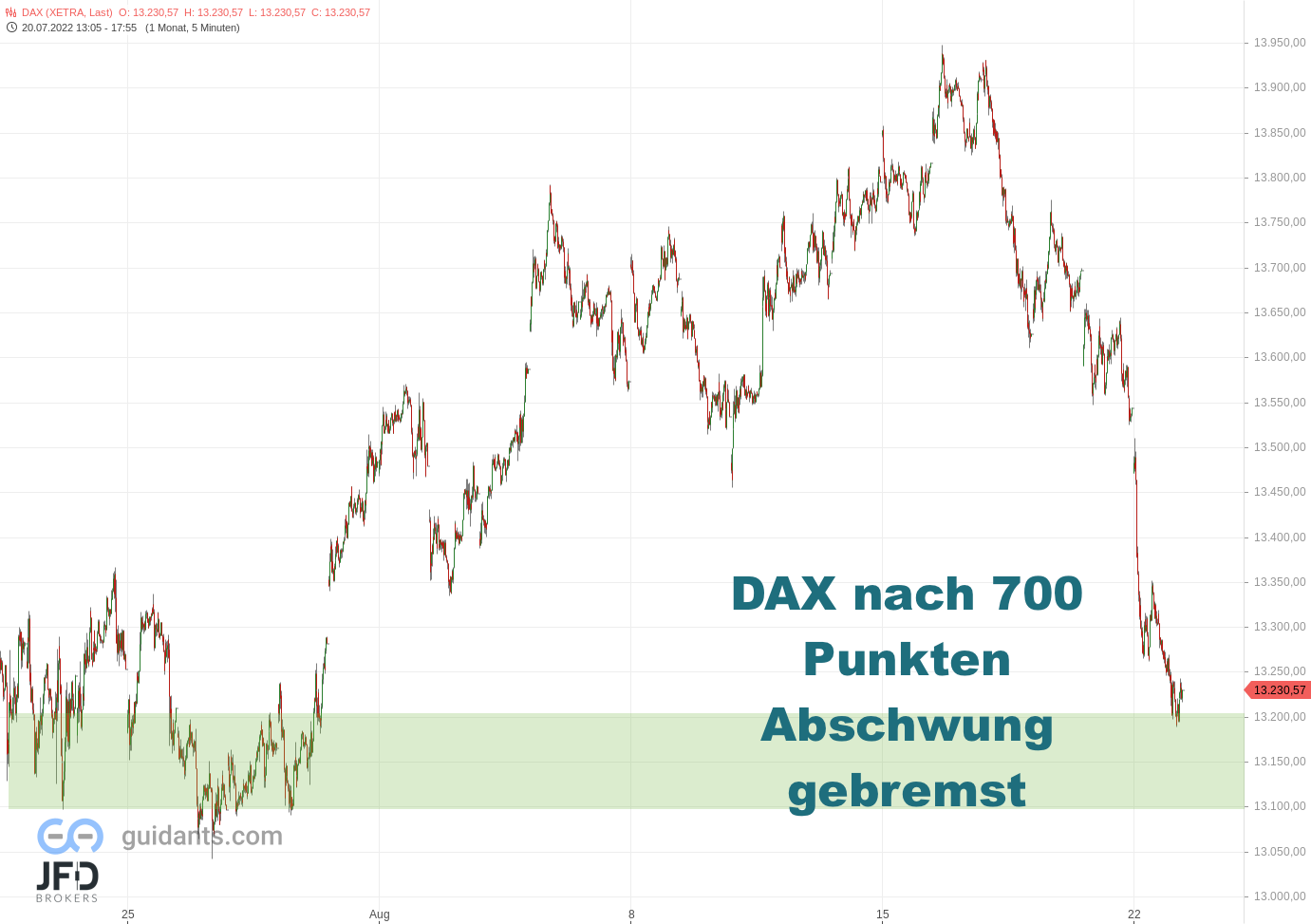 Ich hatte die 13.471 Punkte als wichtiges Level verzeichnet, da hier der Umschwung vom Plus ins Minus eines Monats erfolgen könnte. Dort gab es nur eine kurze Gegenbewegung - weitere Verluste reichten dann bis zum Gap des 28. Juli und damit unter 13.300 Punkte.