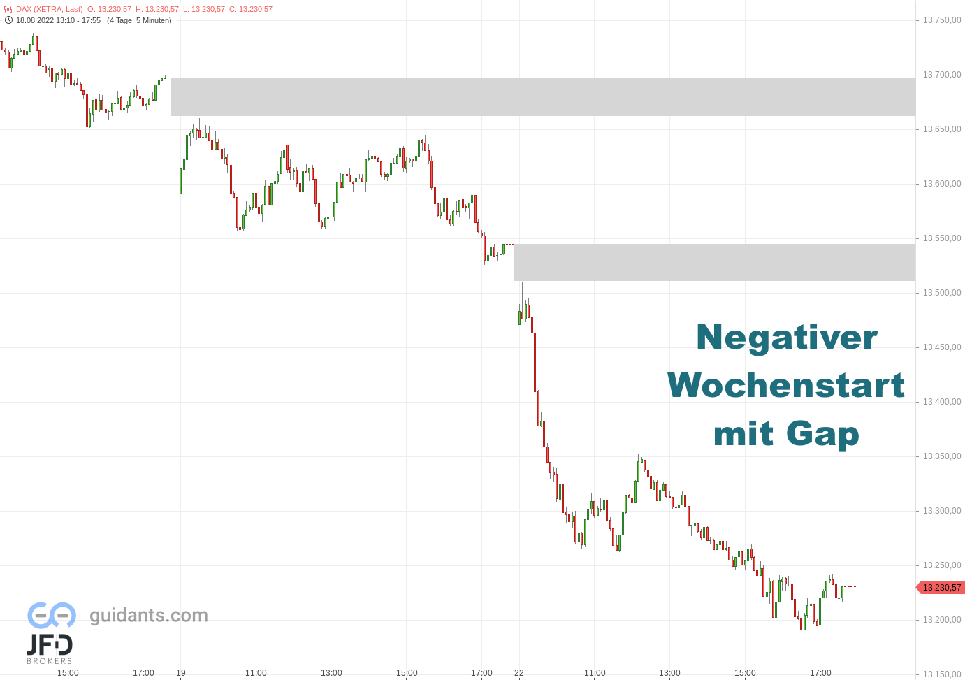 Der Trend des Tages war damit eindeutig und endete erneut fast am Tagesende. Als Tief wurde die 13.189 verankert und damit ein Minus von zwei Prozent festgestellt. Das Gap vom Morgen wie auch das Gap vom Freitag sind somit im Chartbild weiterhin sichtbar: