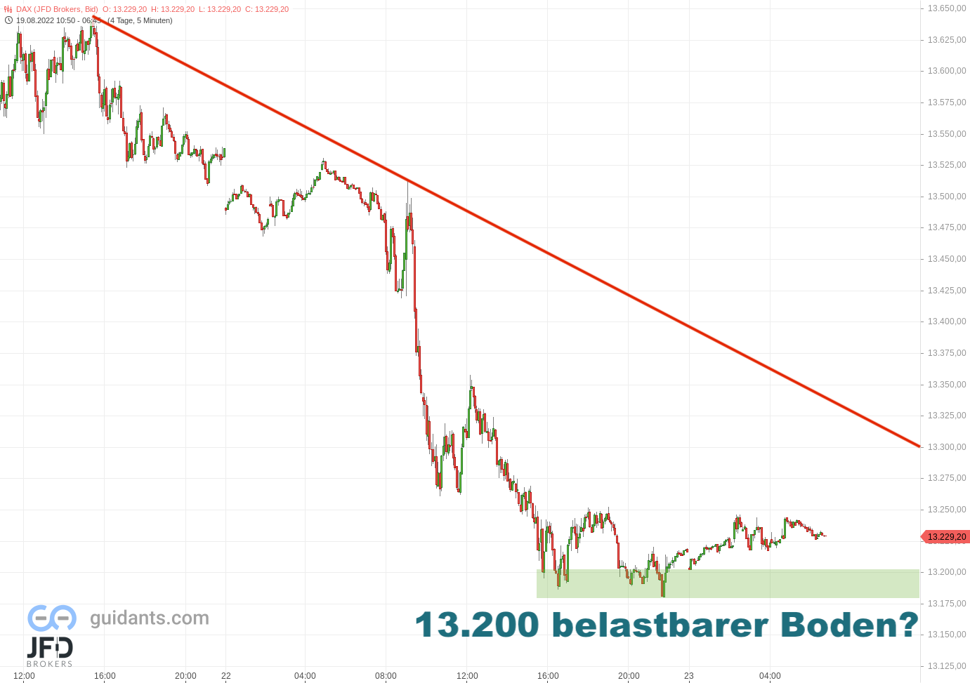In der Vorbörse hat sich der Kurs um das Level vom Xetra-Schluss des Montags festgefahren. Erst einmal sind keine weiteren Abgaben in Sicht. Das Tief um 13.189 halte ich dennoch für einen Dip möglich: