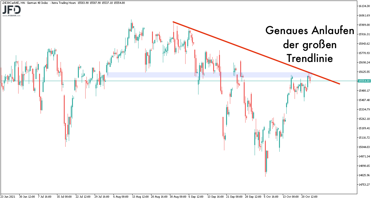 Schafft der DAX einen Ausbruch auf der Oberseite, sind die nächsten Ziele bei 15.699 (das Hoch nach der Bundestagswahl) sowie der 15.800 (obere Range-Kante aus dem Sommer und noch ein geöffnetes Gap) zu finden. Ab dem Verlaufstief des Septembers lässt sich zudem ein Aufwärtstrend konstruieren: