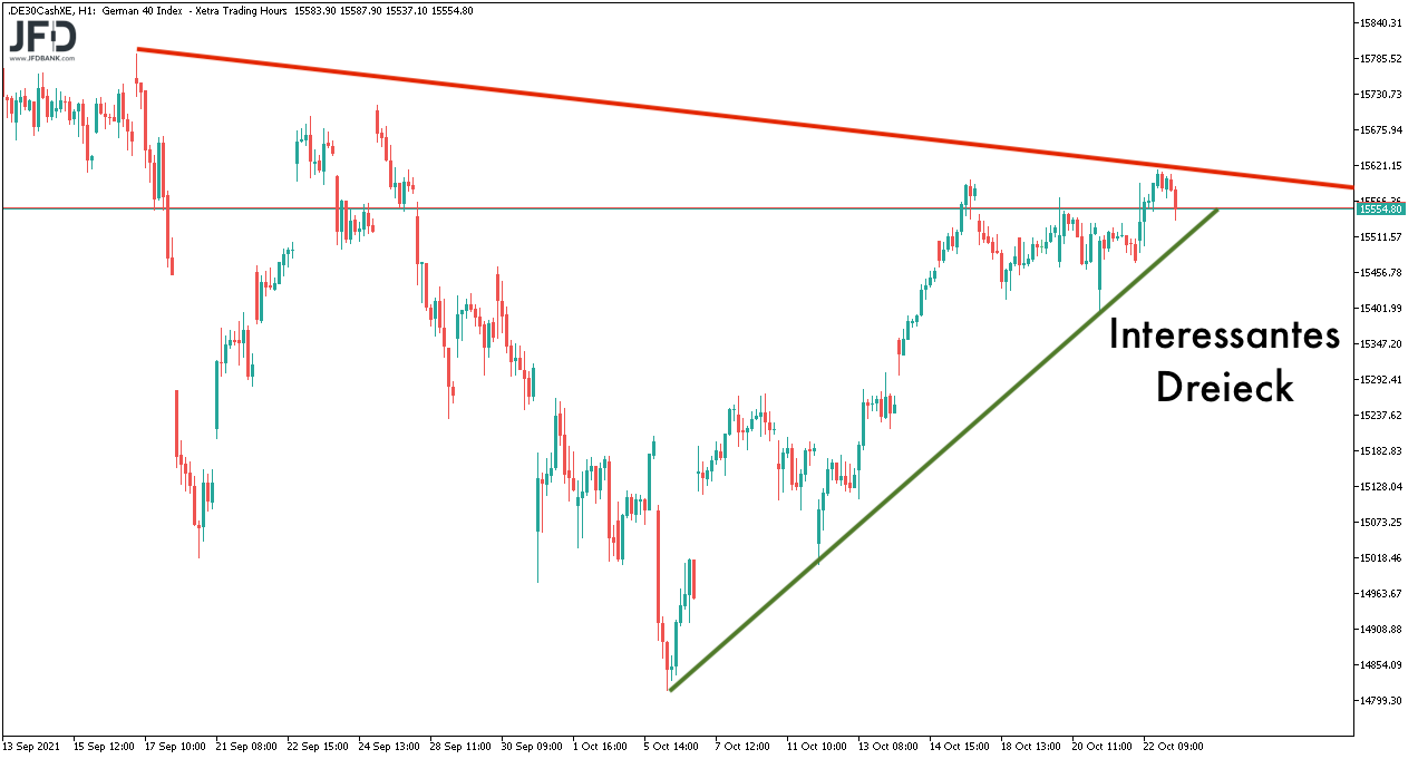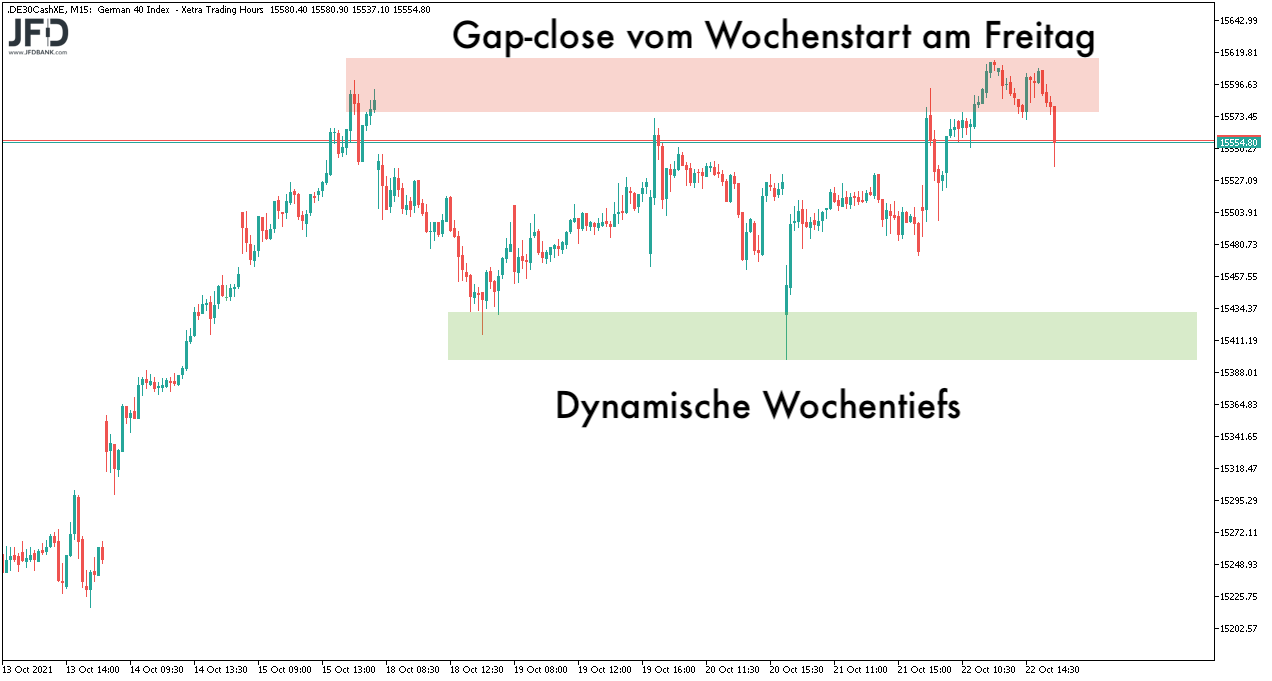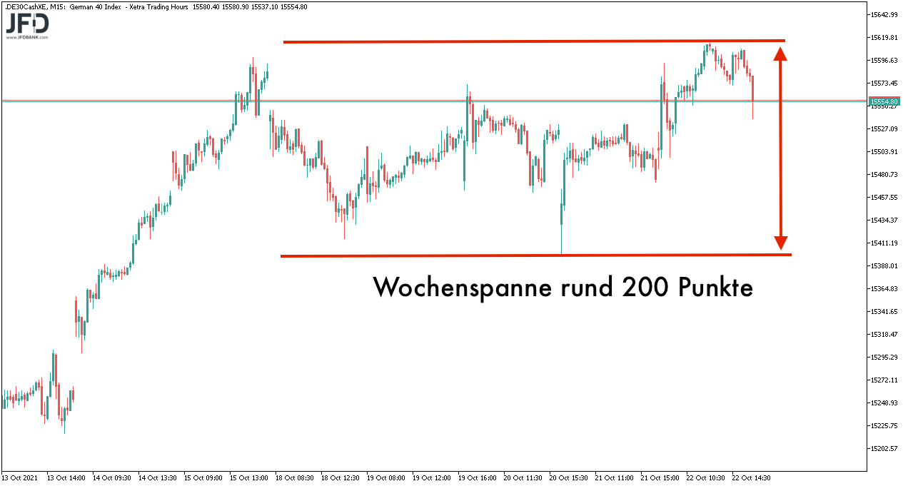Die 15.600 gilt somit nun als Widerstandsbereich und die dynamisch erzielten Wochentiefs knapp über 15.400 Punkten als Unterstützung. Insgesamt sprechen wir hier auch nur von einer Handelsspanne zwischen Wochentief und Wochentief von 200 Punkten (15.416 bis 15.614), wie hier zu sehen ist: