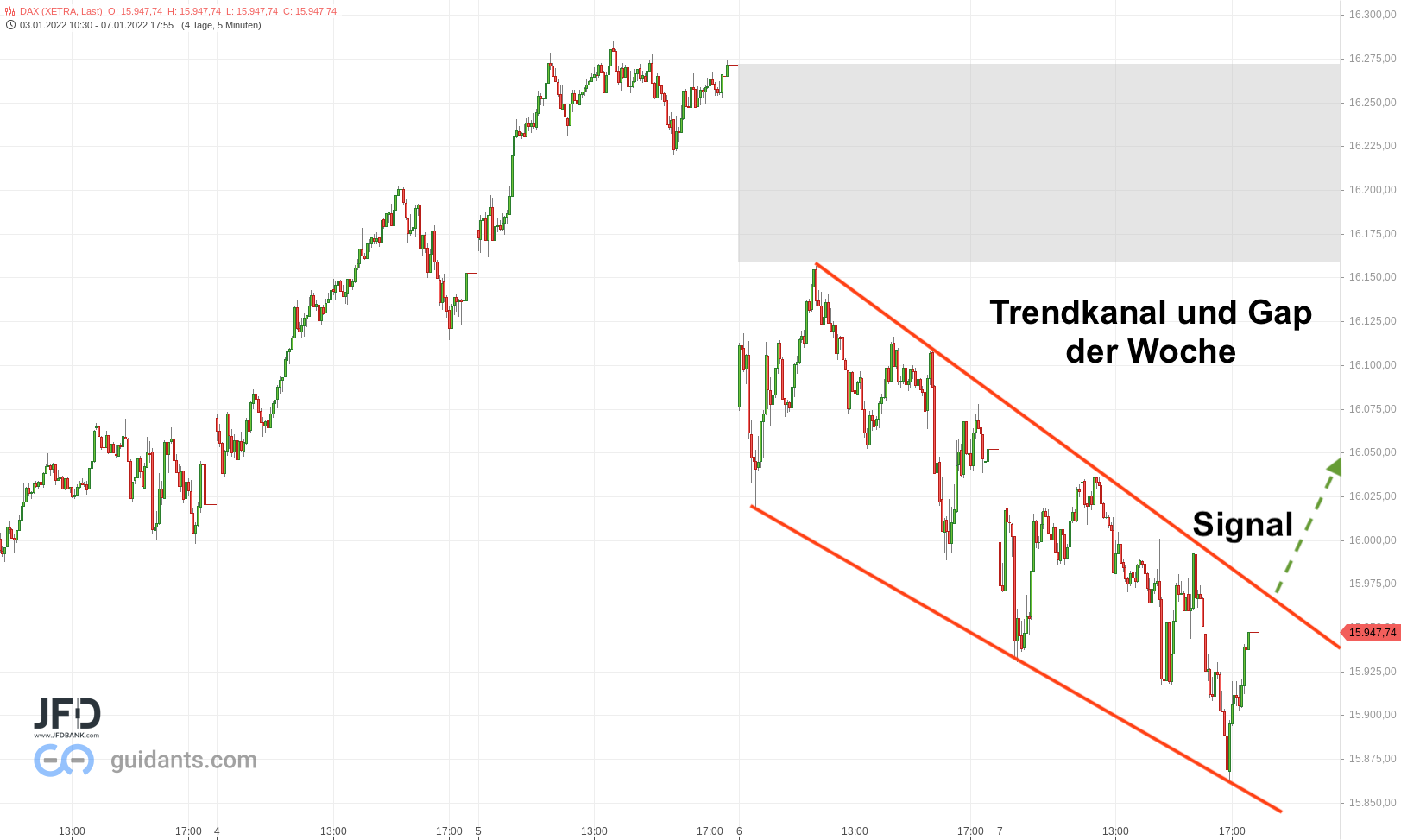 Zum Wochenstart gelang noch einmal ein kurzer Pullback an diese Marke und mit 16.015 Punkten sogar leicht darüber. Damit wurde gleich in der Vorbörse das Signal aus der Wochenanalyse bzw. vom Morgen umgesetzt (Rückblick):