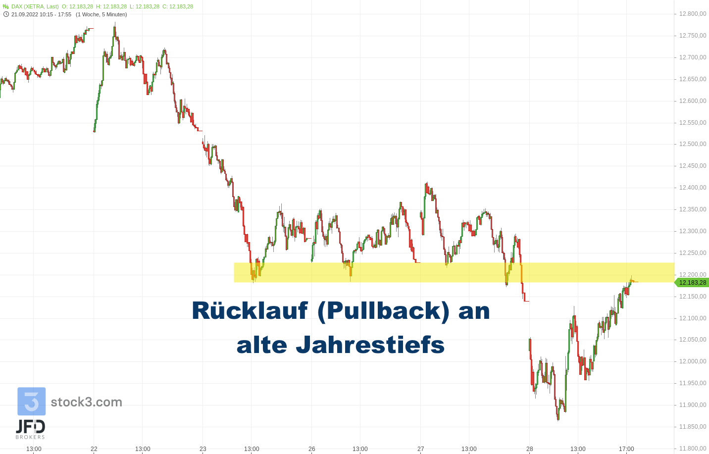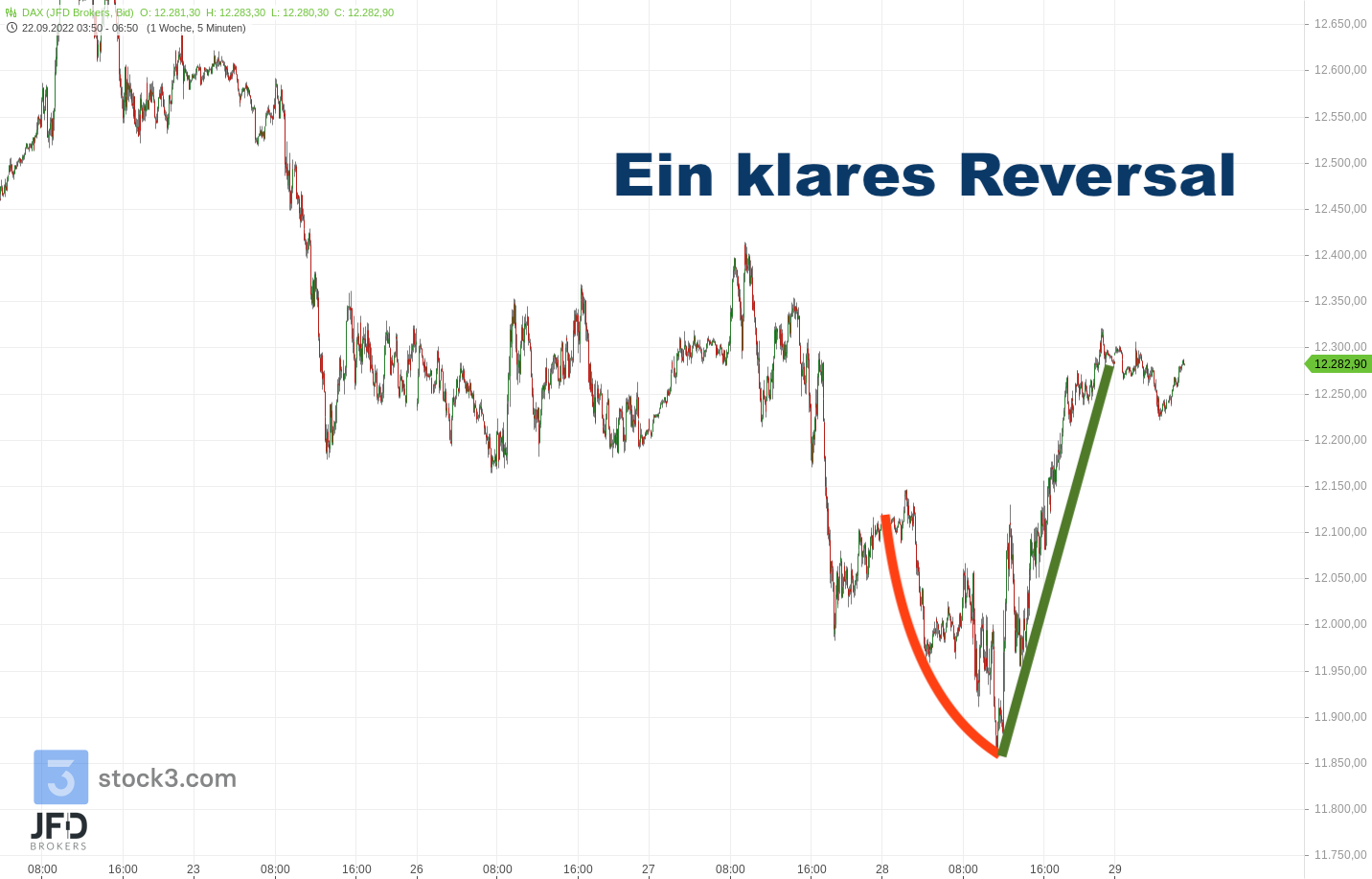 Nach einem Test der 12.000 gab es weitere Abgaben und bis zum Mittag dann ein dynamisches Tief bei 11.862 Punkten. Erst dort vollzog sich eine Bodenbildung - parallel zu einer Meldung von der Notenbank Englands, den Markt zu stützen. Sie kaufen wieder Anleihen und wollen so das Britische Pfund vor dem weiteren Verfall bewahren.
