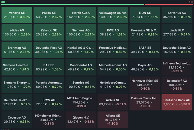 Die Mischung bei den Aktien zeigte damit auch wieder eine positive Marktbreite. Selbst eine Vonovia erholte sich. Einzig die Deutsche Bank macht weiter "Sorgen", was ich gleich im Video erörtere. Hier zu sehen ist die Verteilung der DAX-Aktien als Heatmap: