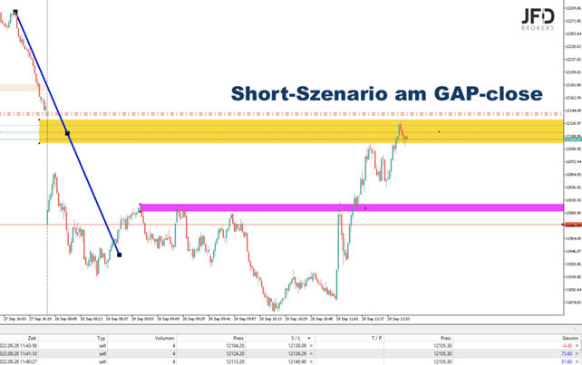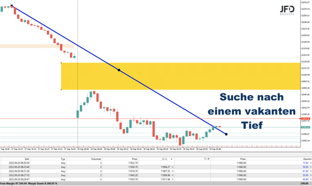 Damit brachte der Handelsstart Kurse unter 12.000 Punkten und weitere Stopp-Auslösungen mit sich. In diesem Umfeld fand ich das Suchen nach einem Long-Setup sehr spannend und dokumentierte dies im Livestream entsprechend. Daraus ist dieser Trade entnommen, der das Ziel des Rücklaufs an die 12.000 hatte:
