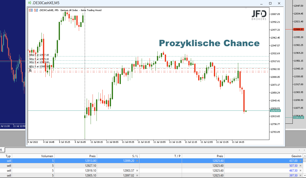 Ich hatte dies nur als Gegenbewegung im mittelfristigen Bild interpretiert und erst einmal antizyklisch Short-Trades vollzogen, die jedoch nur mit Teilverkäufen ins Ziel liefen und keinen großen Ertrag generierten: