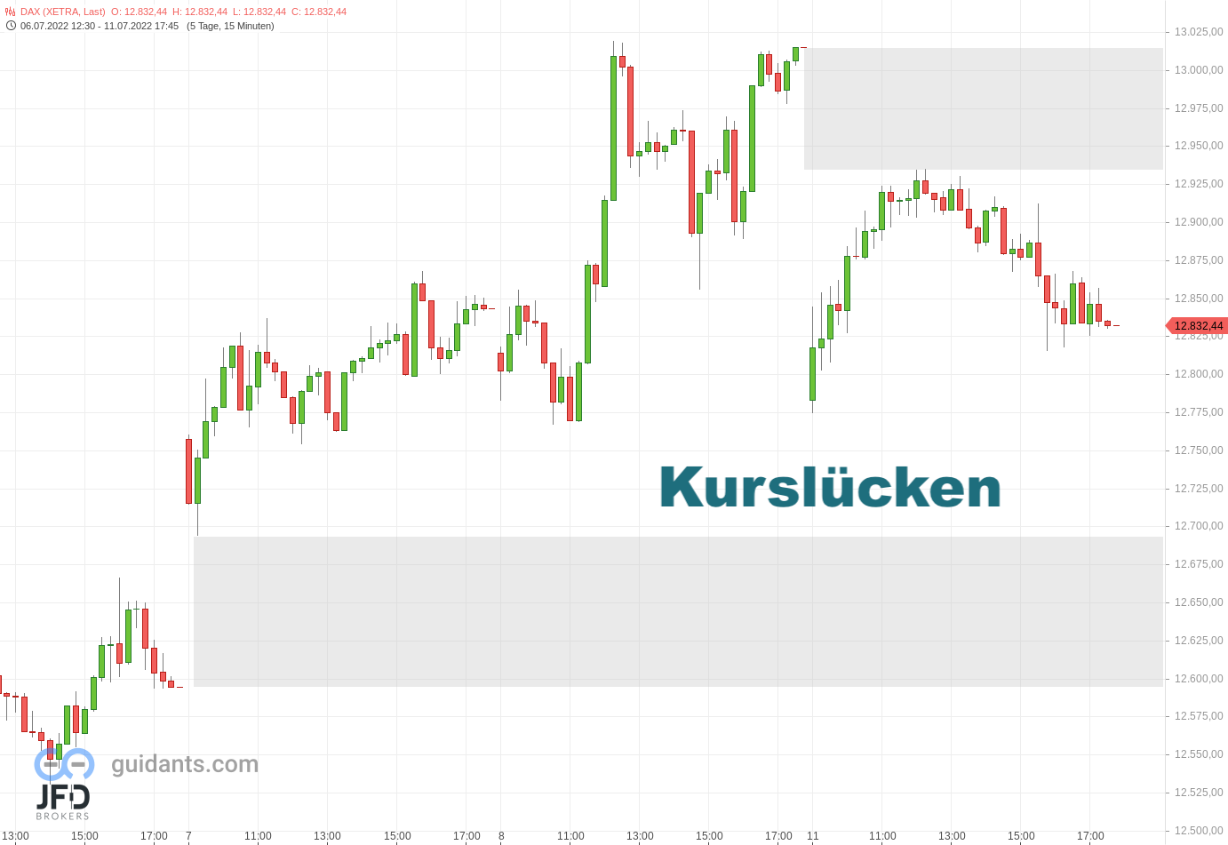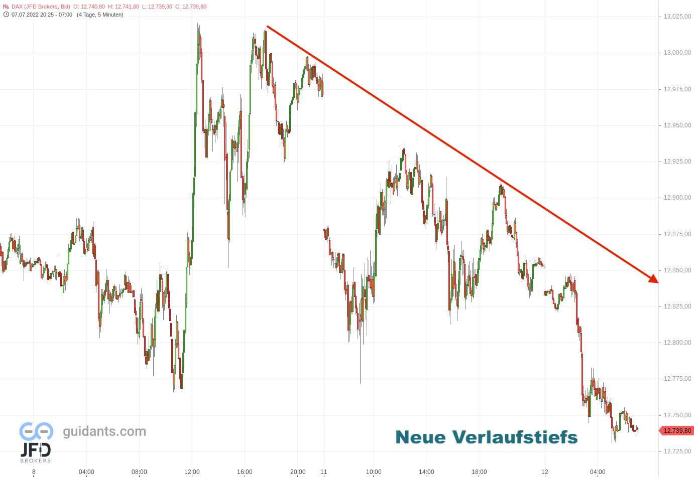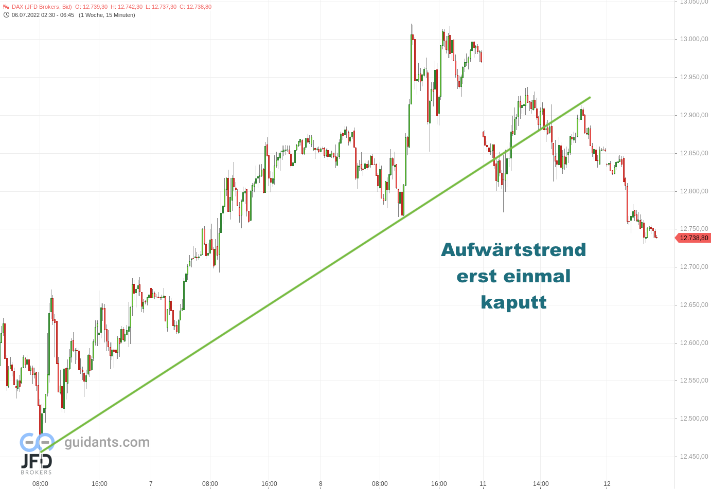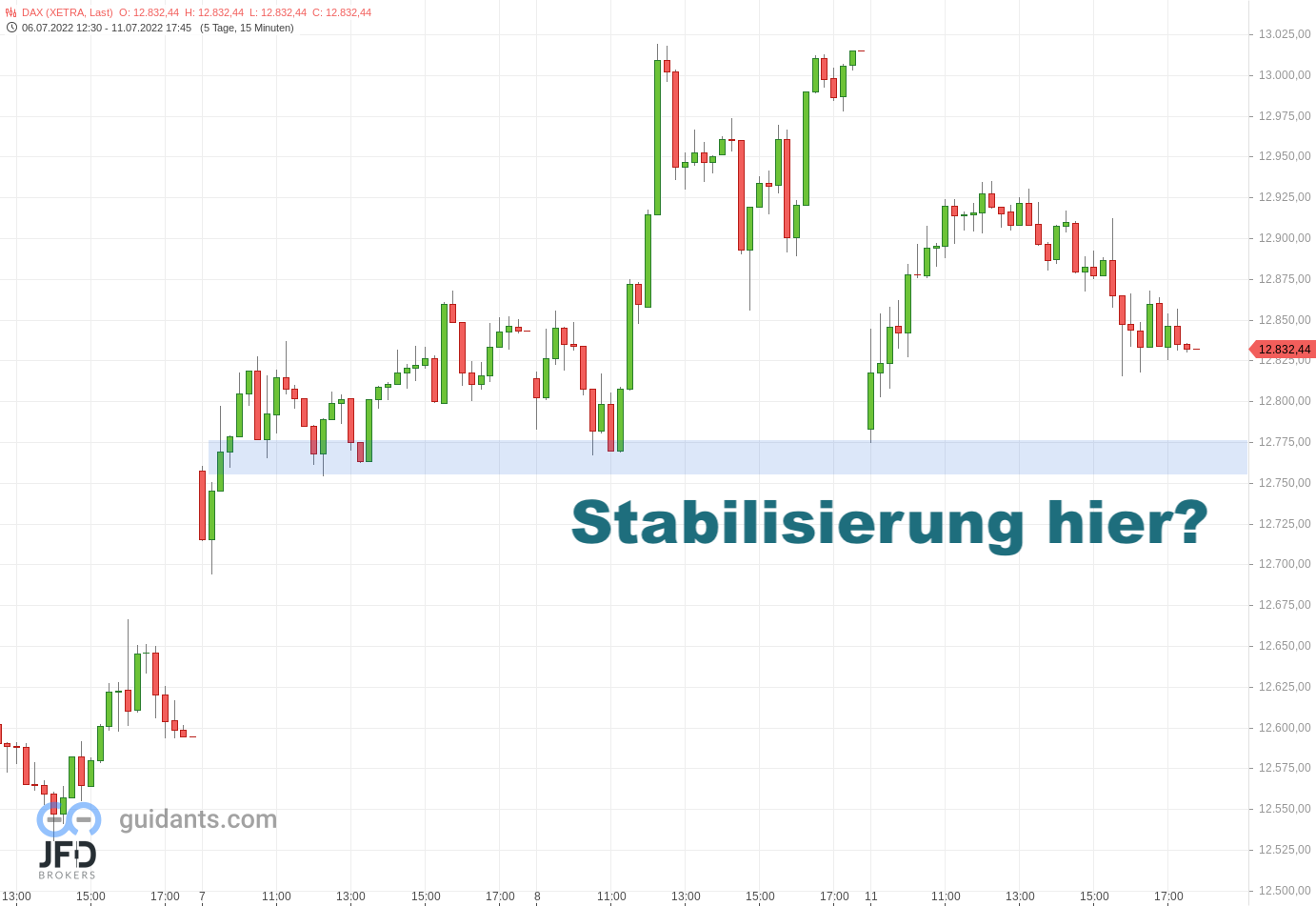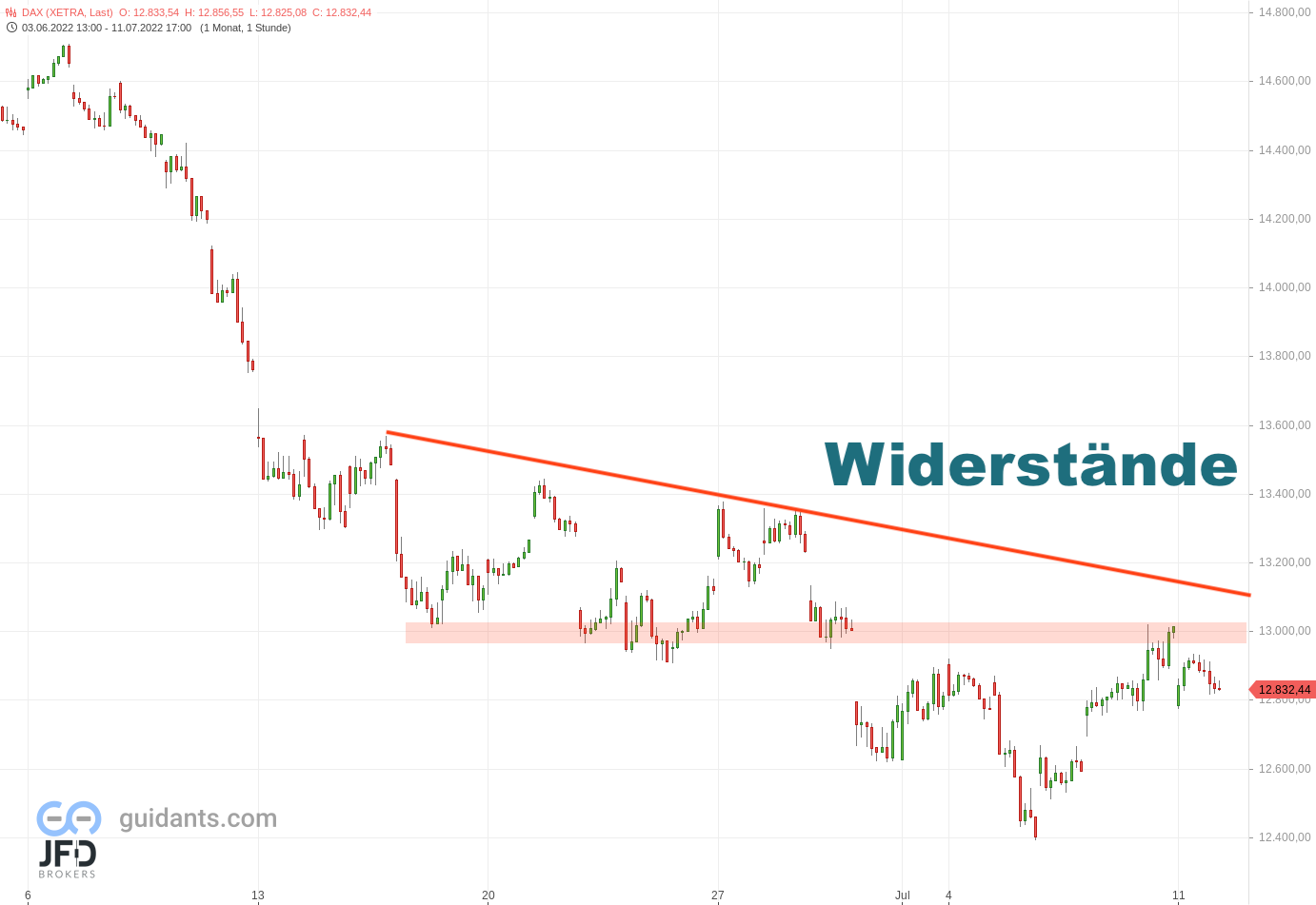 Direkt zum Handelsstart wurde eine Kurslücke auf der Oberseite eingezogen und der Index stand wieder um 12.800 Punkte. Erneut gehörten Zins-, Inflations- und Rezessionsängste zum Tagesbild. Zudem liegen wichtige Wirtschaftsnachrichten in dieser Woche und die beginnenden US-Bilanzsaison der Unternehmen vor uns.