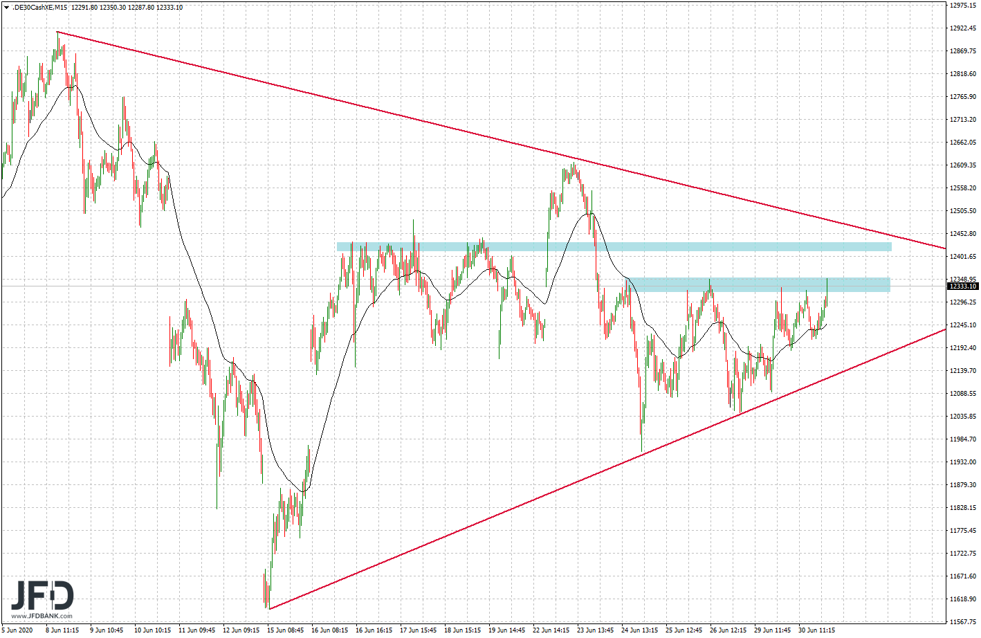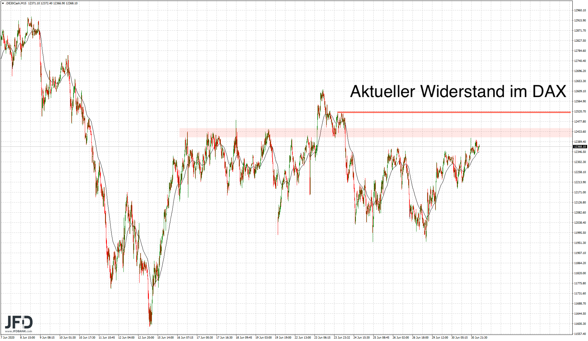 Von 12.400 bis 12.440 ist somit ein Schlagabtausch der kurzfristigen Marktteilnehmer zu erwarten und mit einem Ausbruch verbunden dann weitere Dynamik auf der Oberseite, wie wir es 23. Juni bereits gesehen hatten. Dabei ist das nächste Ziel darüber bereits die 12.520 und damit ein zweiter Versuch, die Range auf der Oberseite zu verlassen.