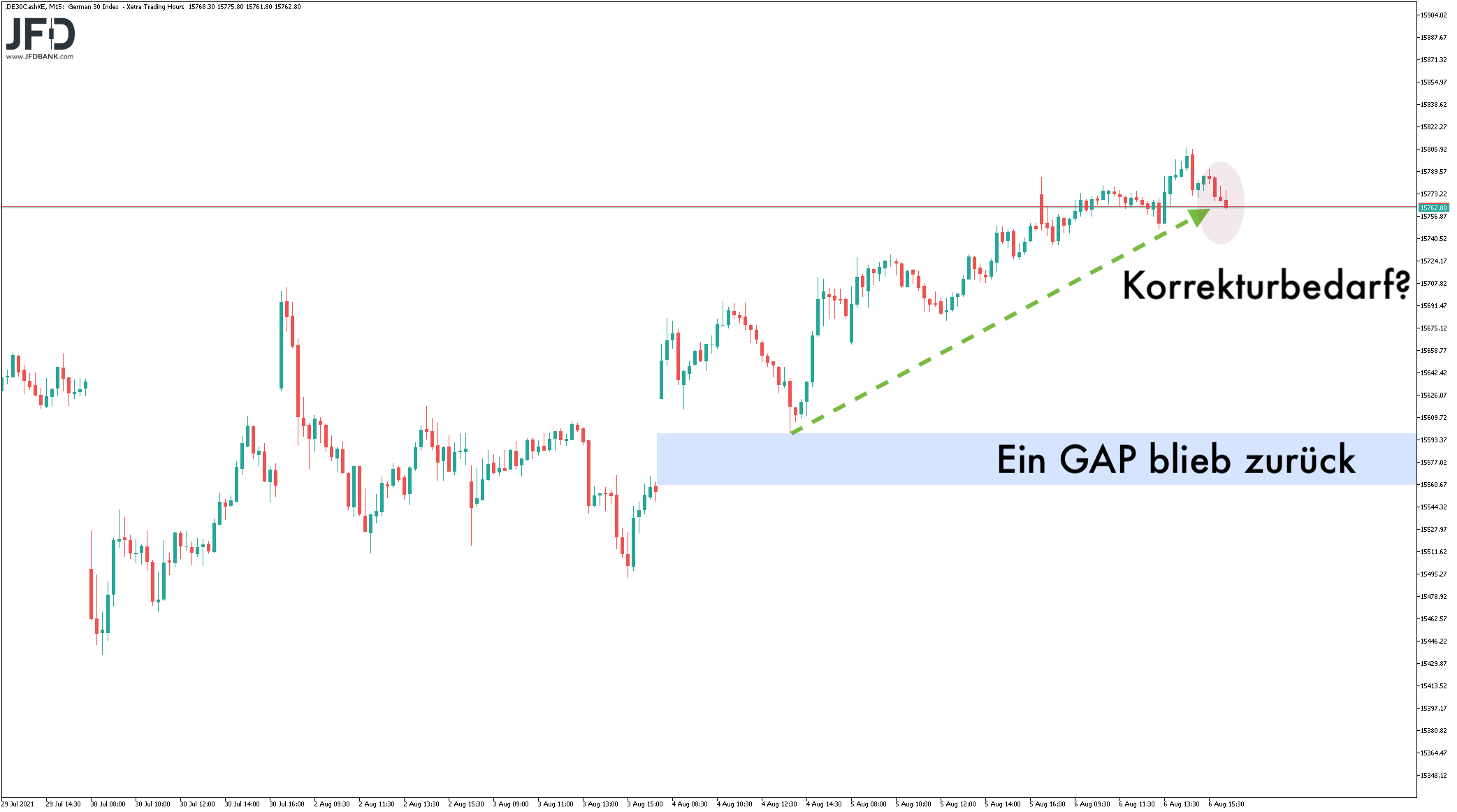 Aus Trading-Sicht stellt sich hier die Frage, wie tief eine etwaige Korrektur diesmal verläuft. Natürlich müssen es nicht die kompletten 750 Punkten zurück sein. Gewisse Marken auf der Unterseite habe ich dennoch im Visier. Zu nennen sind die vorherigen Widerstandszonen um 15.710 und 15.600 und knapp darunter das noch zurückgeblieben GAP aus der Vorwoche: