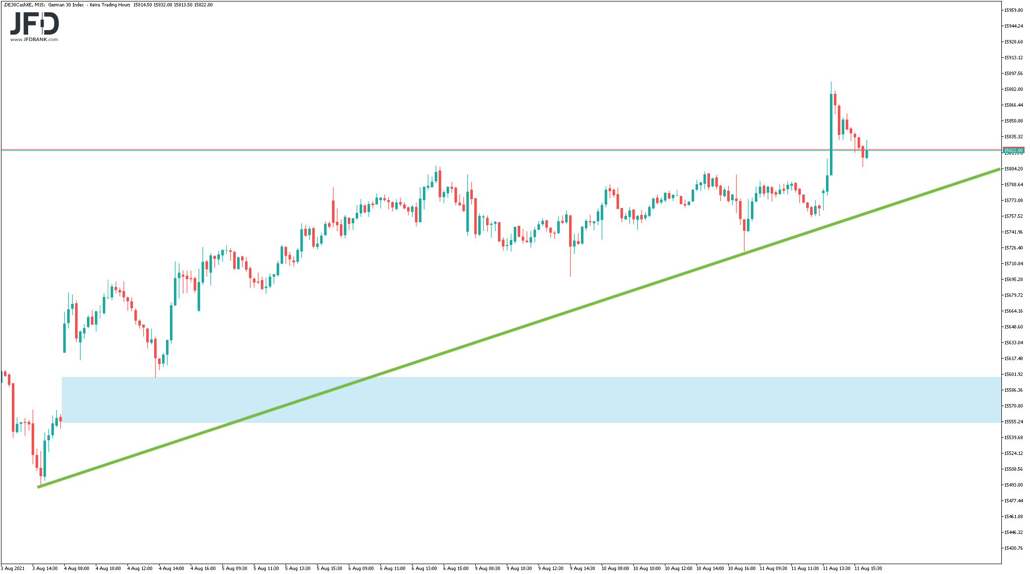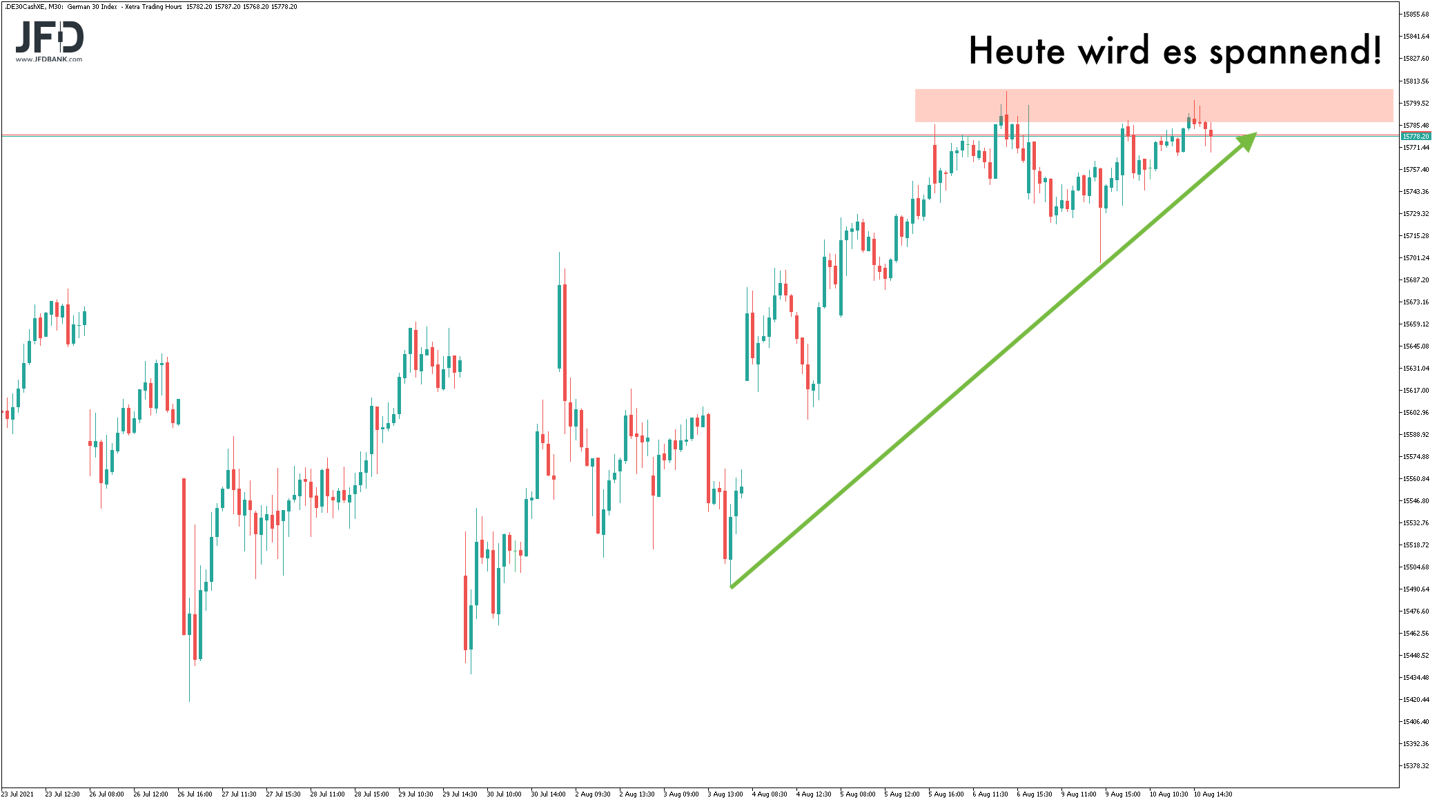 Bei den Daten aus Deutschland klangen Sorgen mit an. Denn die deutschen Verbraucherpreise stiegen im Juli um 3,8 Prozent im Vergleich zum Vorjahresmonat an und deuten damit auf weiter voranschreitende Inflation hin. Direkt zum Handelsstart tauchte der DAX daher erst einmal ab und unterschritt das Vortagestief. Jedoch nur kurz - in der ersten Handelsstunde war diese Bewegung bereits negiert und wir starrten gebannt auf die 15.800.