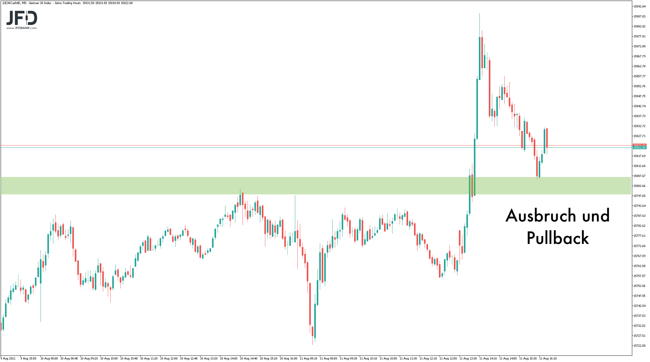 Bis zum XETRA-Ende wurde das Niveau über der 15.800 verteidigt und ebenso ein Schlusskursrekord eingestellt. Der Pullback war charttechnisch sehr gesund und fusste genau auf dem ehemaligen Hochpunkt: