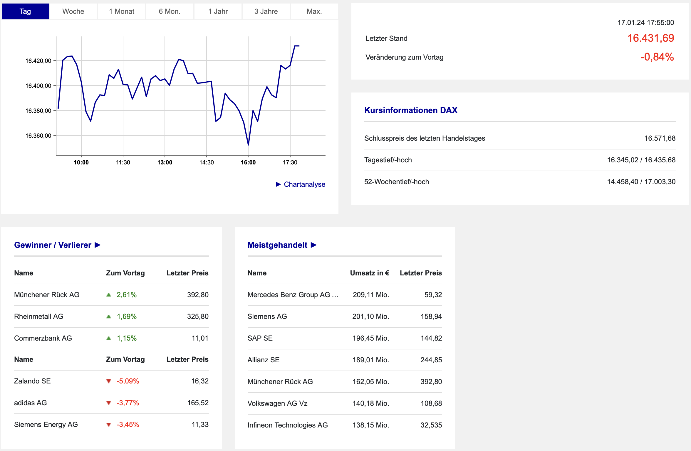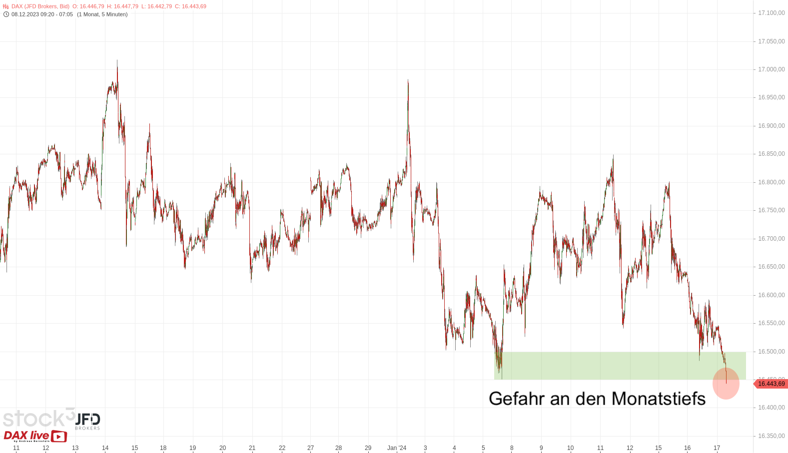 In dieser Handelswoche ist der Druck am Aktienmarkt deutlich auf der Unterseite zur spüren. Wir hatten in der Morgenanalyse am 16.01.2024 bereits auf die Gefahr eines Durchbruchs hingewiesen (Rückblick):