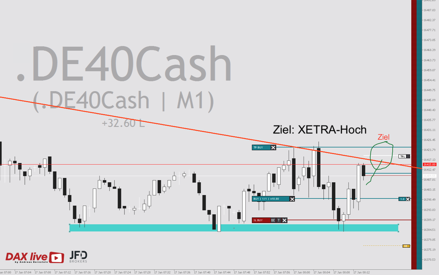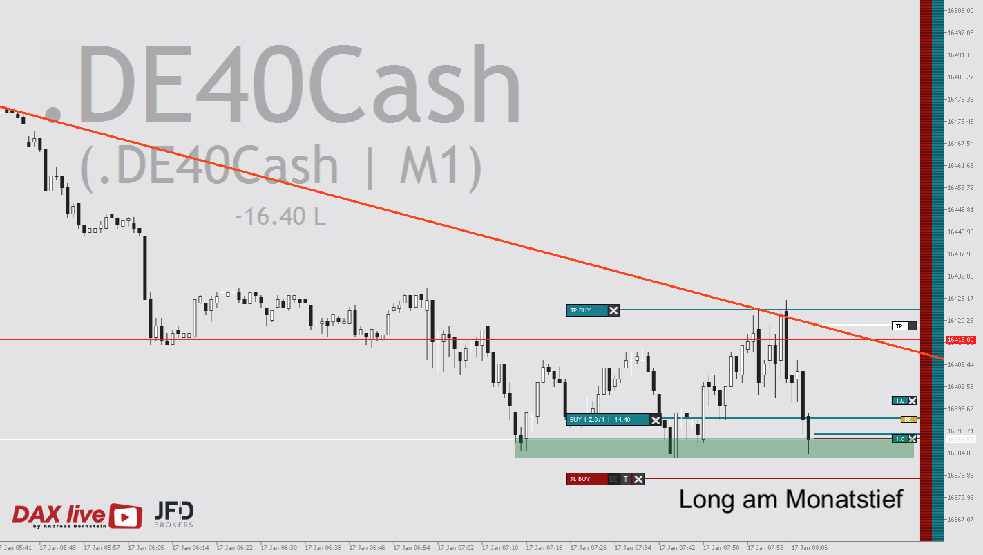 Dort nahm die Volatilität bereits vor 9.00 Uhr zu und sorgte damit für ein neues GAP auf der Unterseite. Direkt zum Handelsstart XETRA handelte ich eine potenzielle Stabilisierung mit diesen Parametern erfolgreich: