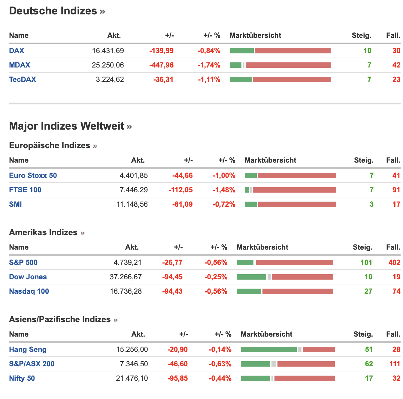 Ebenfalls schwach waren die Kurse in den USA, auf die wir nun blicken und dann direkt die Vorbörse des DAX im nächsten Abschnitt aufzeigen.