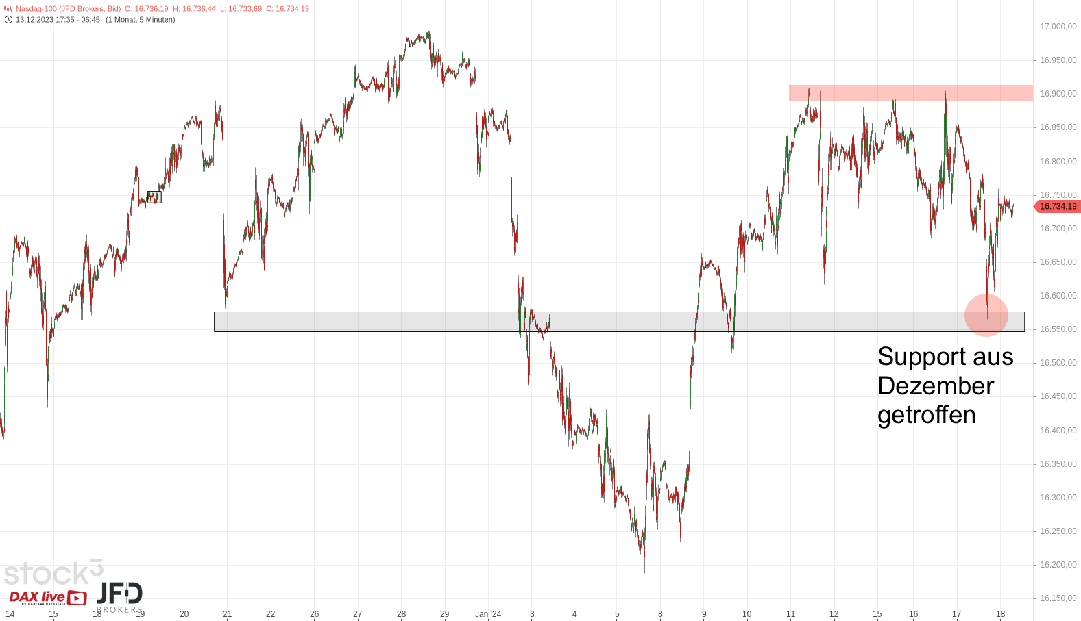 Erst im Handelsverlauf erholte sich der Nasdaq und lief zum Handelsende hin sogar in das GAP vom Morgen hinein. Übergeordnet kann der Abprall an folgendem Dezember-Konsolidierungslevel als Abprall gewertet werden: