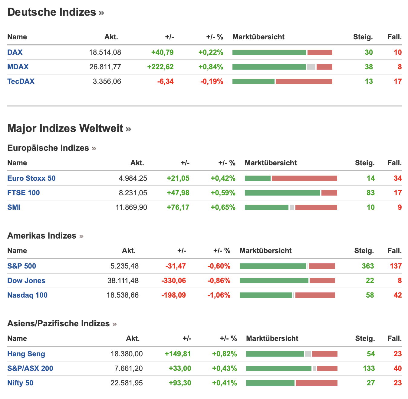 In Summe waren alle großen Indizes an der Wall Street im Minus, nur der Russell 2000 schloss im Gewinn. An dieser Stelle findest Du alle Indizes als Zusammenfassung inklusive Asien vom Morgen: