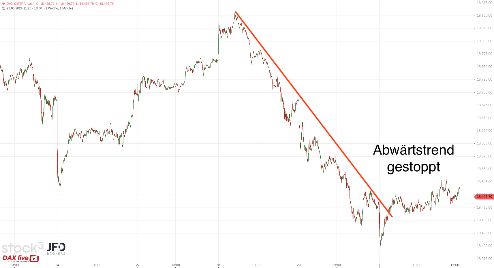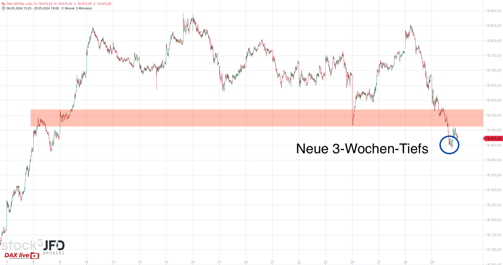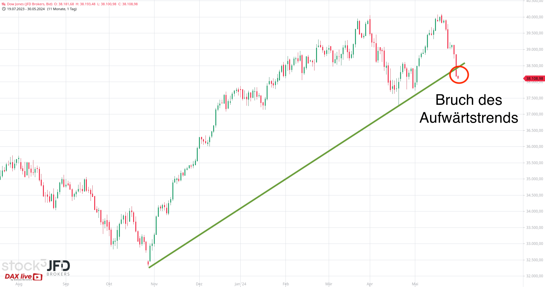 Dieser Trend nahm noch einmal zu und brachte die Aktie um rund 20 Prozent unter Druck. Für den Dow Jones bedeutete es bereits am gestrigen Morgen per Indikation im JFD-Endlos-Kontrakt deutliche Abschläge (Rückblick):