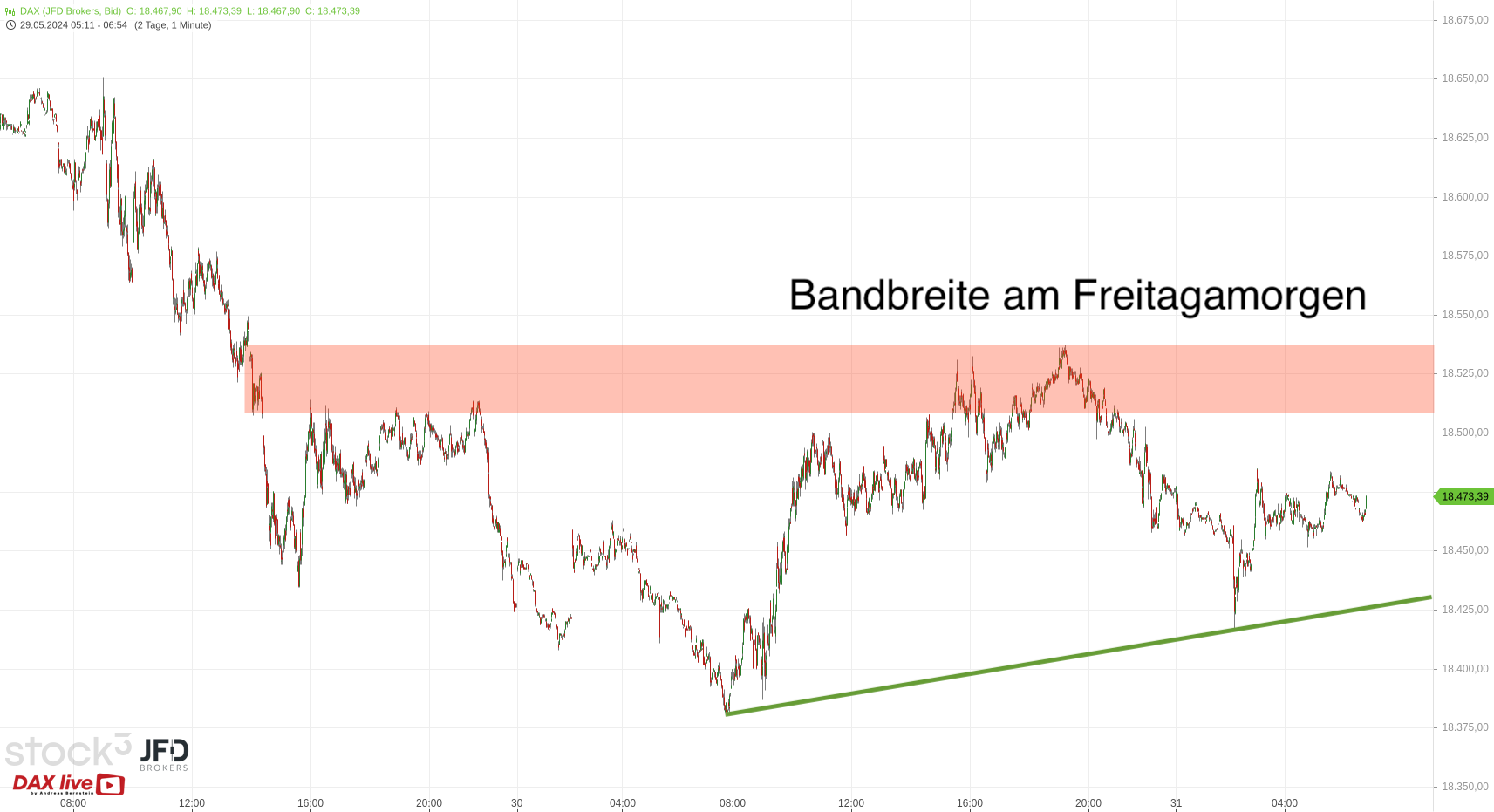In der DAX-Vorbörse notieren wir in der Bandbreite vom Vortag und wieder unter 18.500 Punkten. Es hat sich ein leichter Aufwärtstrend etabliert, der als erster Trigger am Morgen hilfreich sein wird.