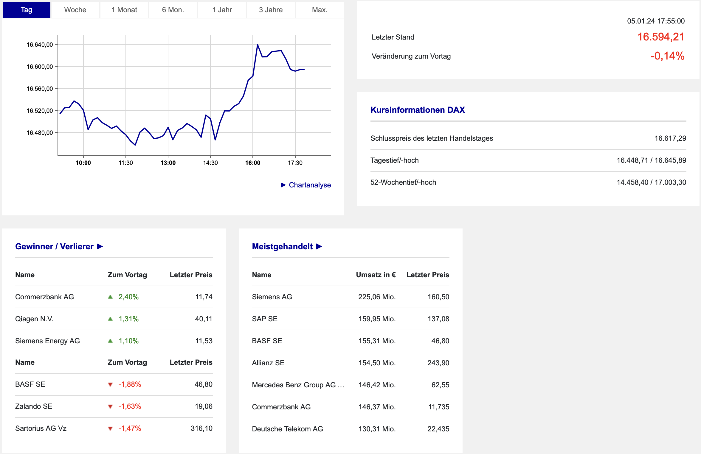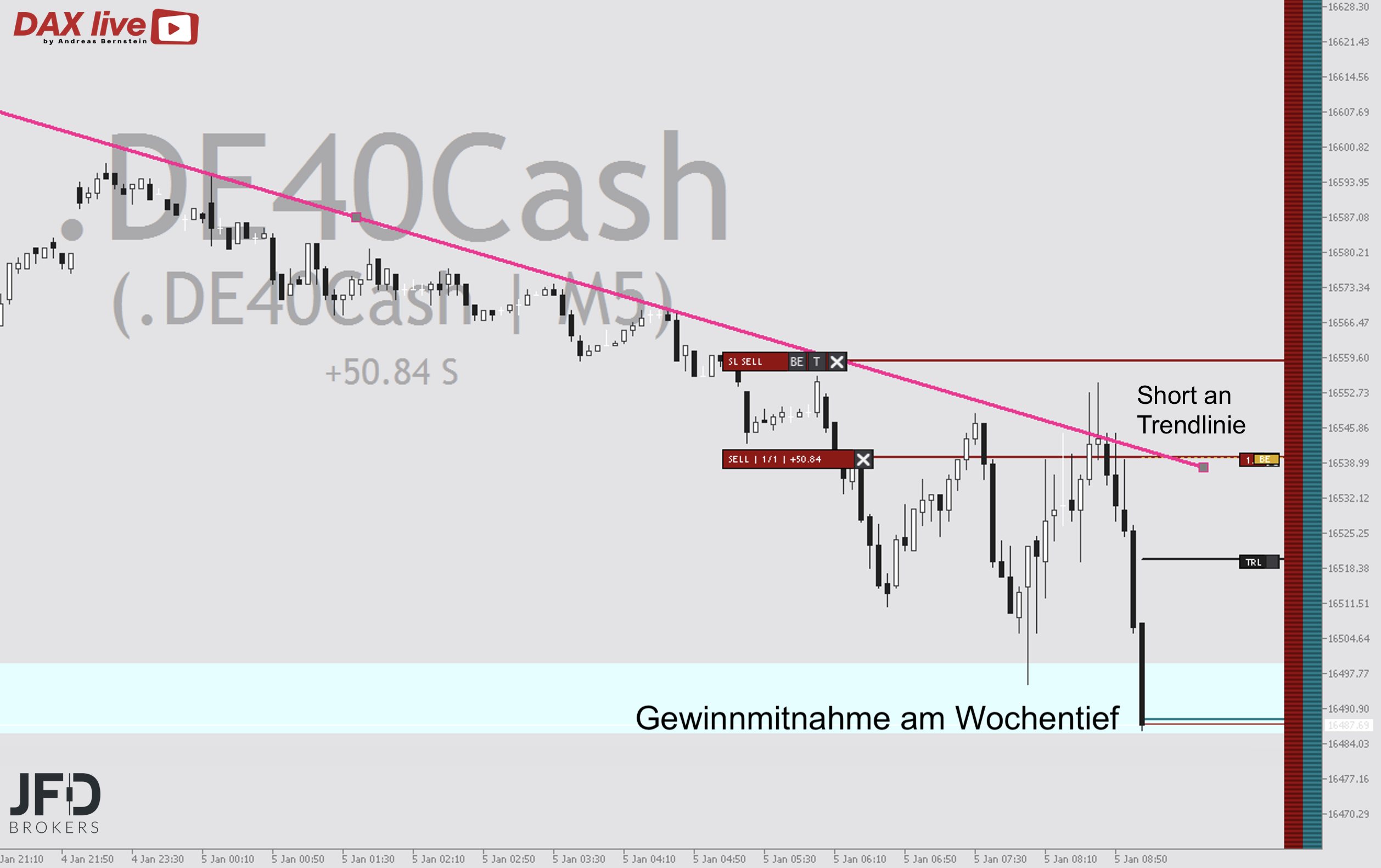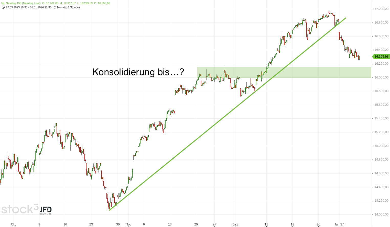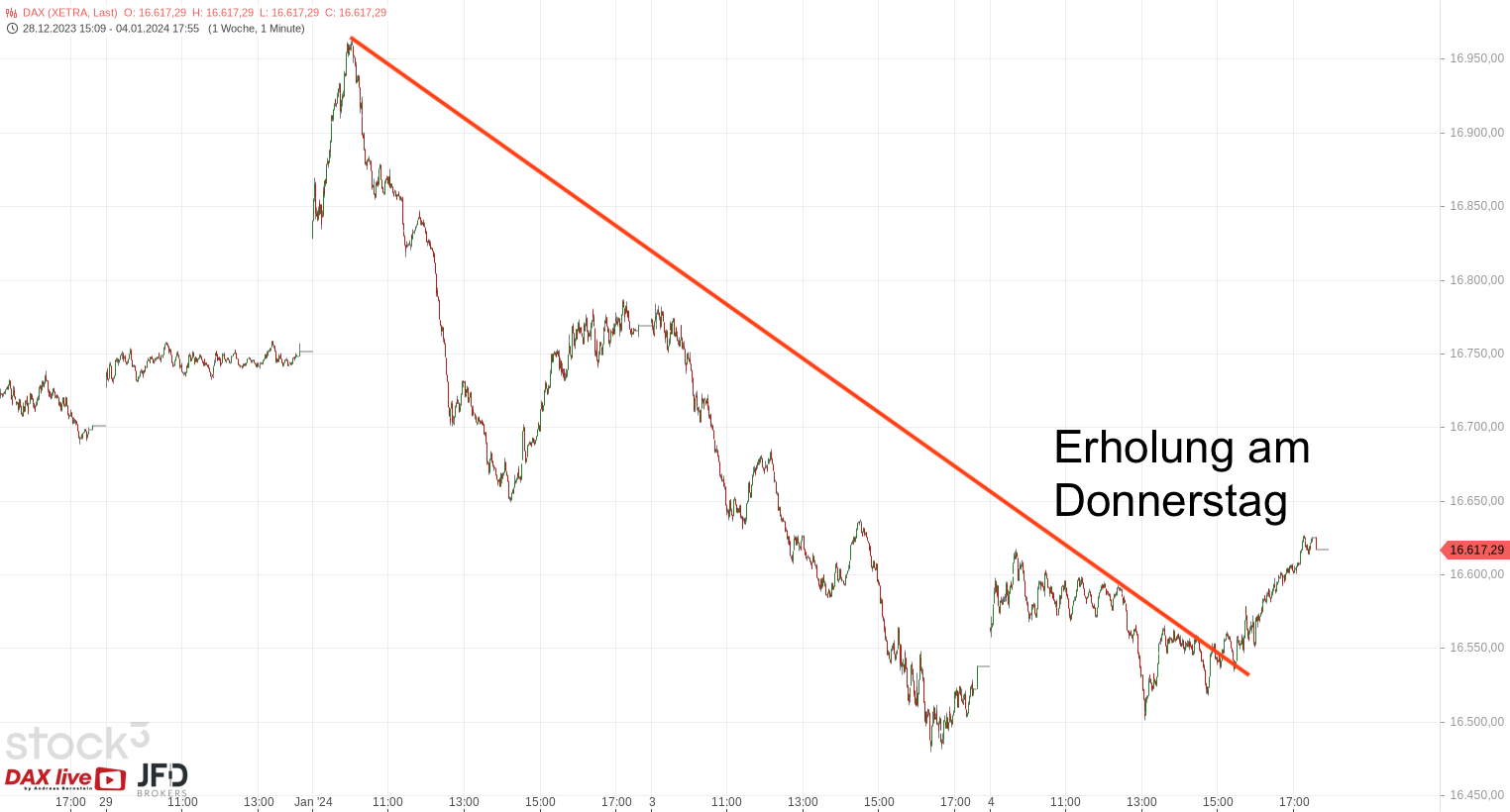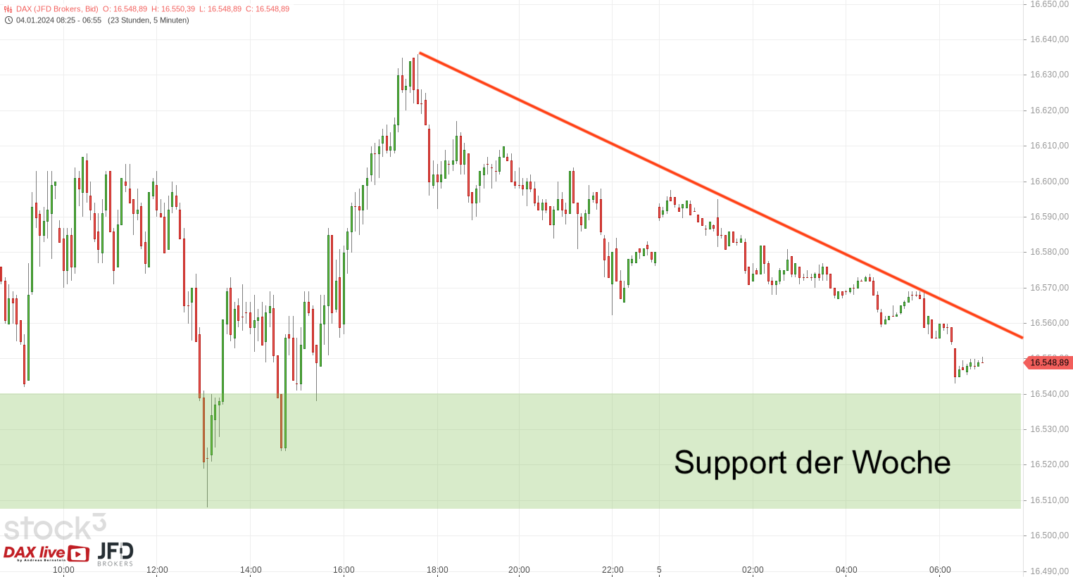 Auch zum Wochenausklang hatten wir eine erhöhte Volatilität an den Aktienmärkten. Mit positiven Voraussetzungen im mittelfristigen Bild stand die 16.6000 zunächst am Donnerstagabend im Fokus, wie wir hier mit dem Trendbruch in der Morgenanalyse am 04.01.2024 aufgezeigt und besprochen hatten: