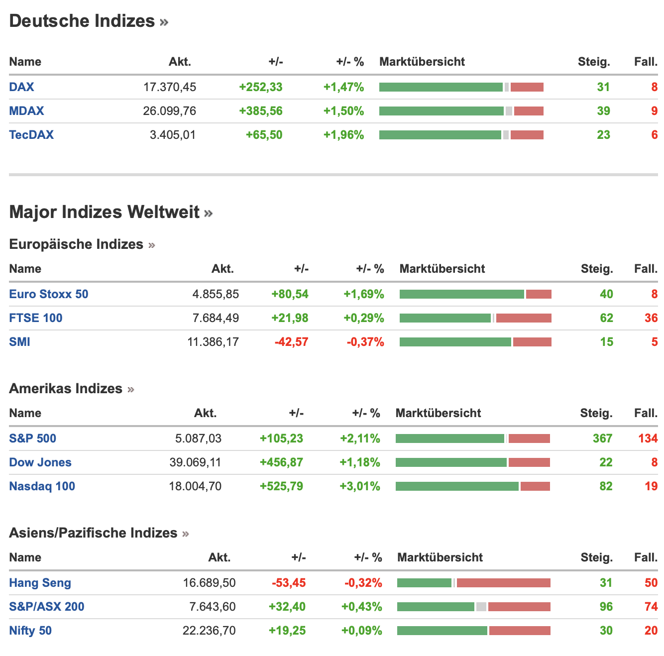 Die Indizes S&P500 und Dow Jones toppten ihr Allzeithoch und zeigten den größten Anstieg seit rund einem Jahr auf. Die Charts habe ich im Video analysiert, sodass an dieser Stelle die Stände der Indizes verzeichnet sind: