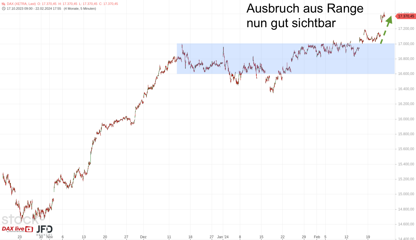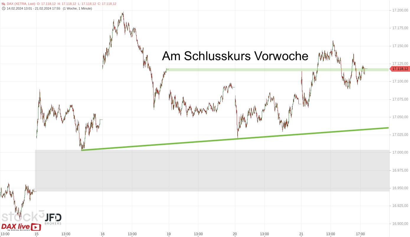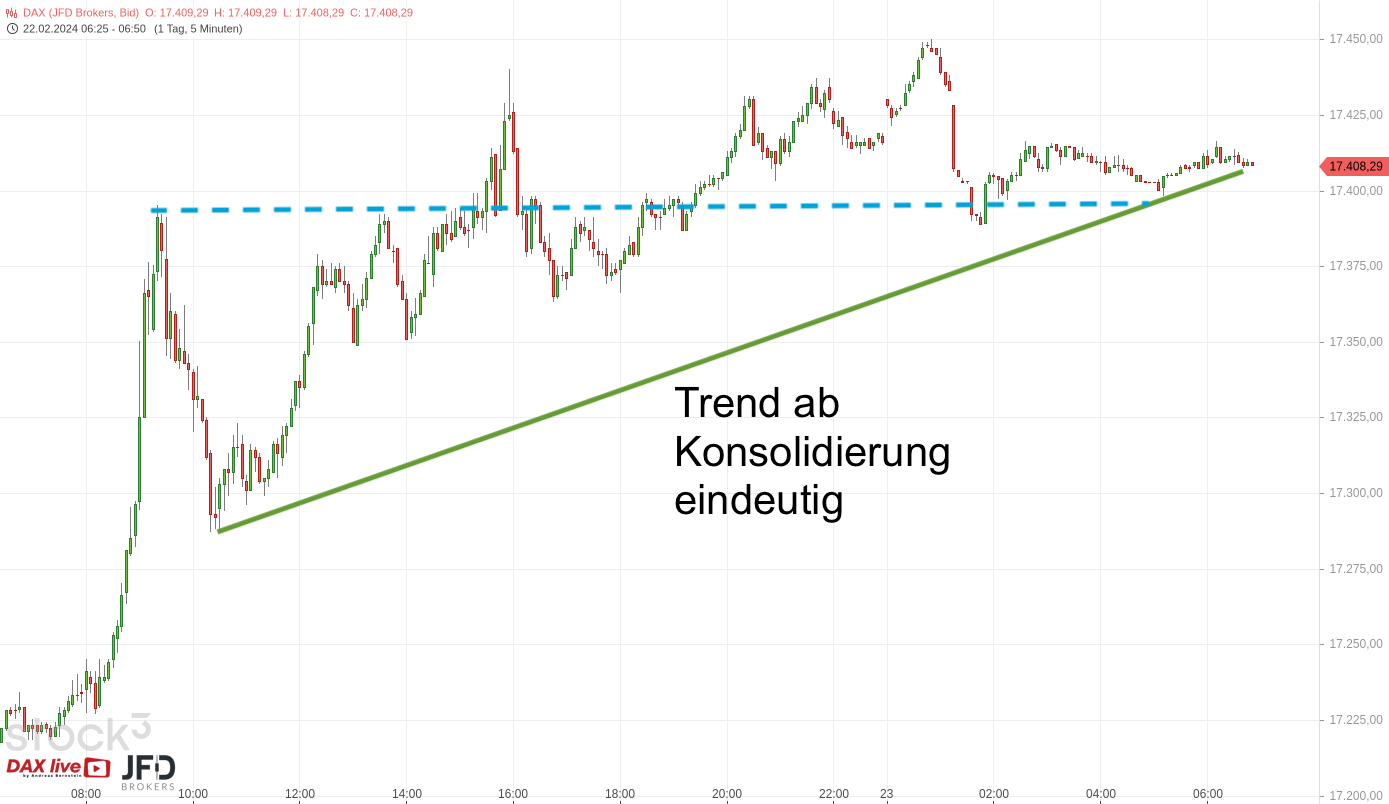 In der Morgenanalyse zum 22.02.2024 blickten wir auf die Erholung des Index über der 17.000er-Marke und damit auf den Grundstein für einen potenziell weiteren Anstieg (Rückblick):