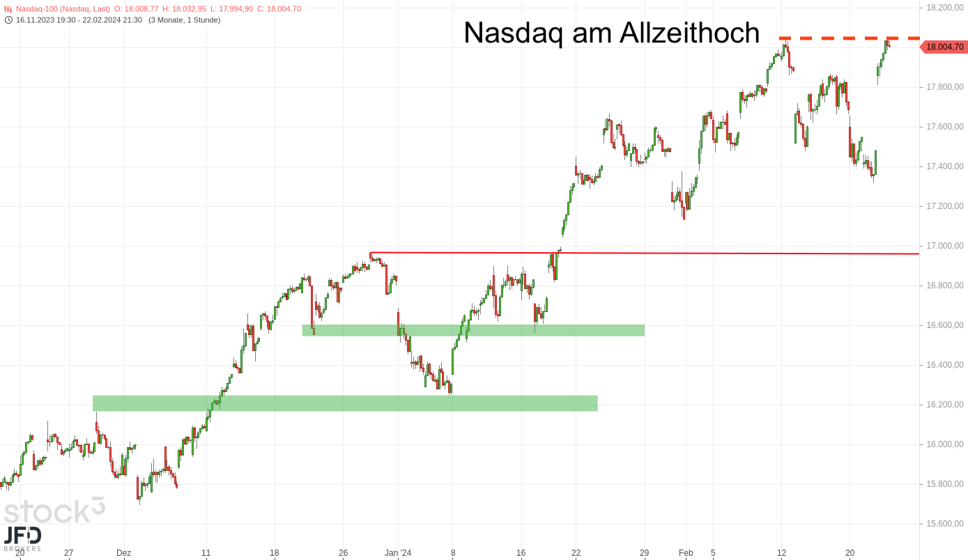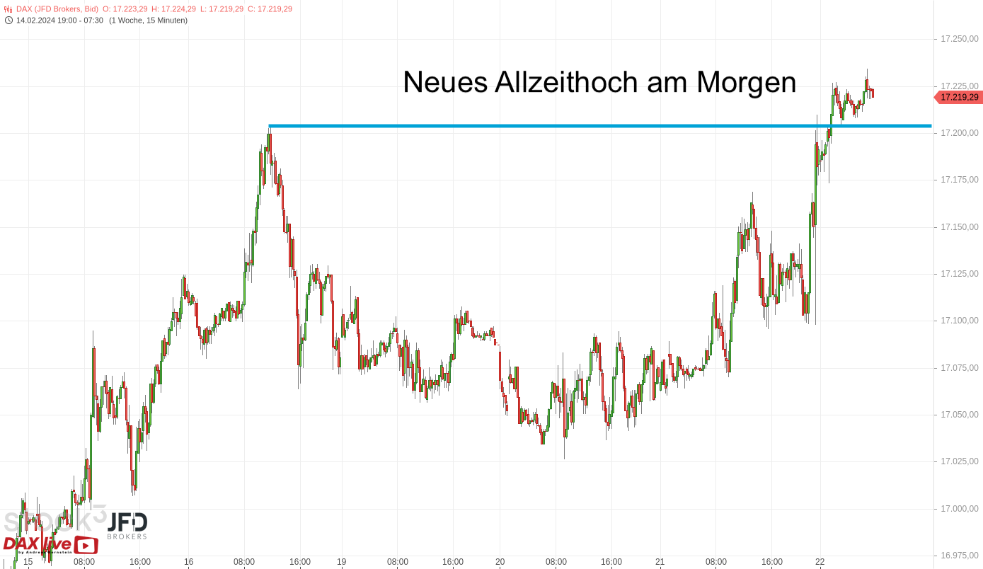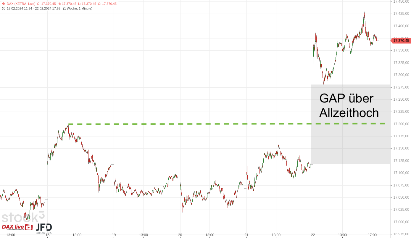 In der Morgenanalyse zum 22.02.2024 blickten wir auf die Erholung des Index über der 17.000er-Marke und damit auf den Grundstein für einen potenziell weiteren Anstieg (Rückblick):