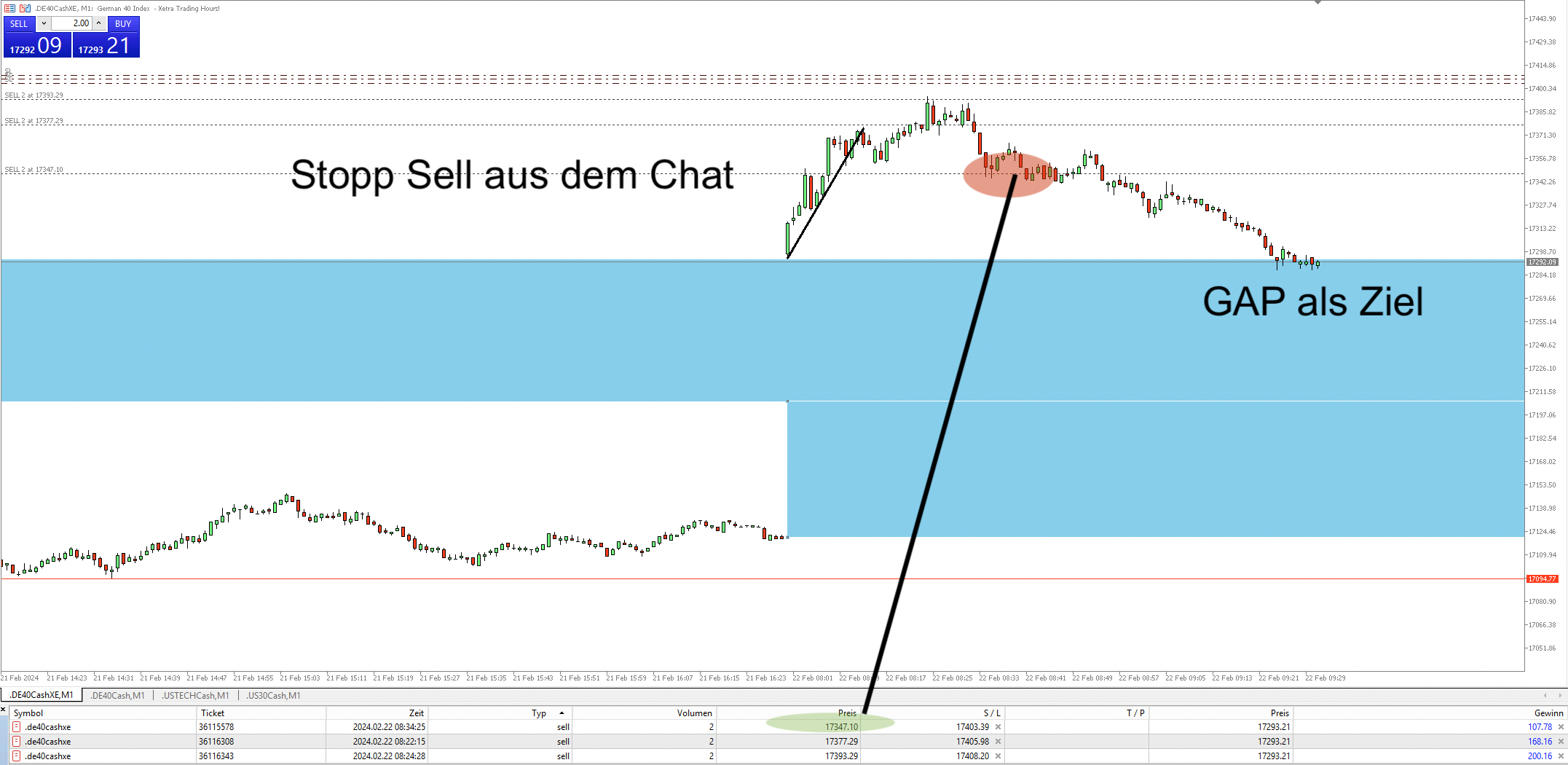 Dieses wurde direkt ausgebaut. Für mein Trading skizzierte sich eine Möglichkeit, den Rücklauf zu handeln, allerdings nur bis zum GAP selbst, was dann als Unterstützung im weiteren Verlauf galt: