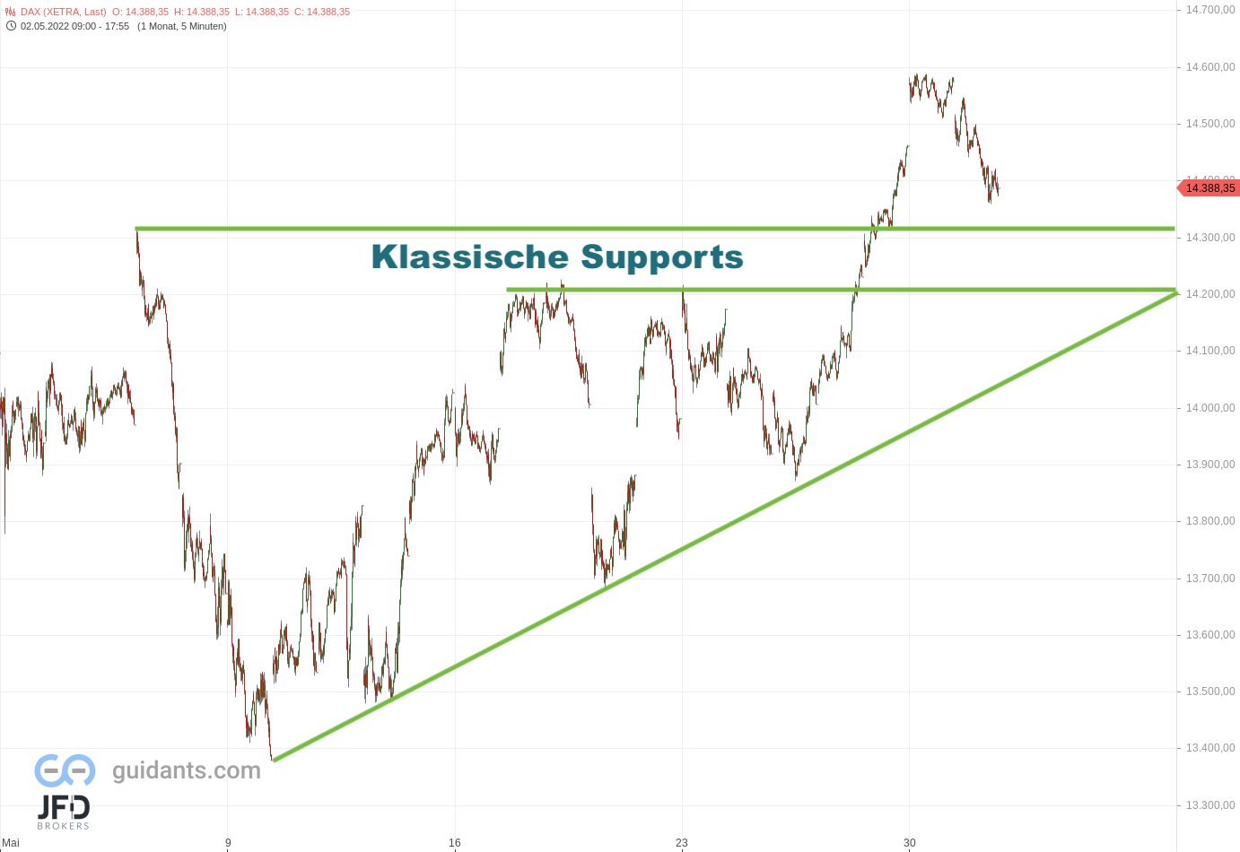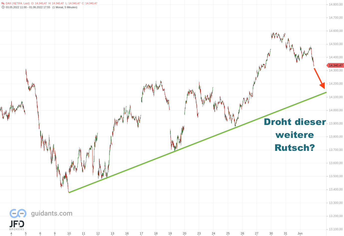 Misslingt der Test, sehe ich einen Test des mittelfristigen Aufwärtstrends, basierend auf den Apriltiefs in die Nähe rücken: