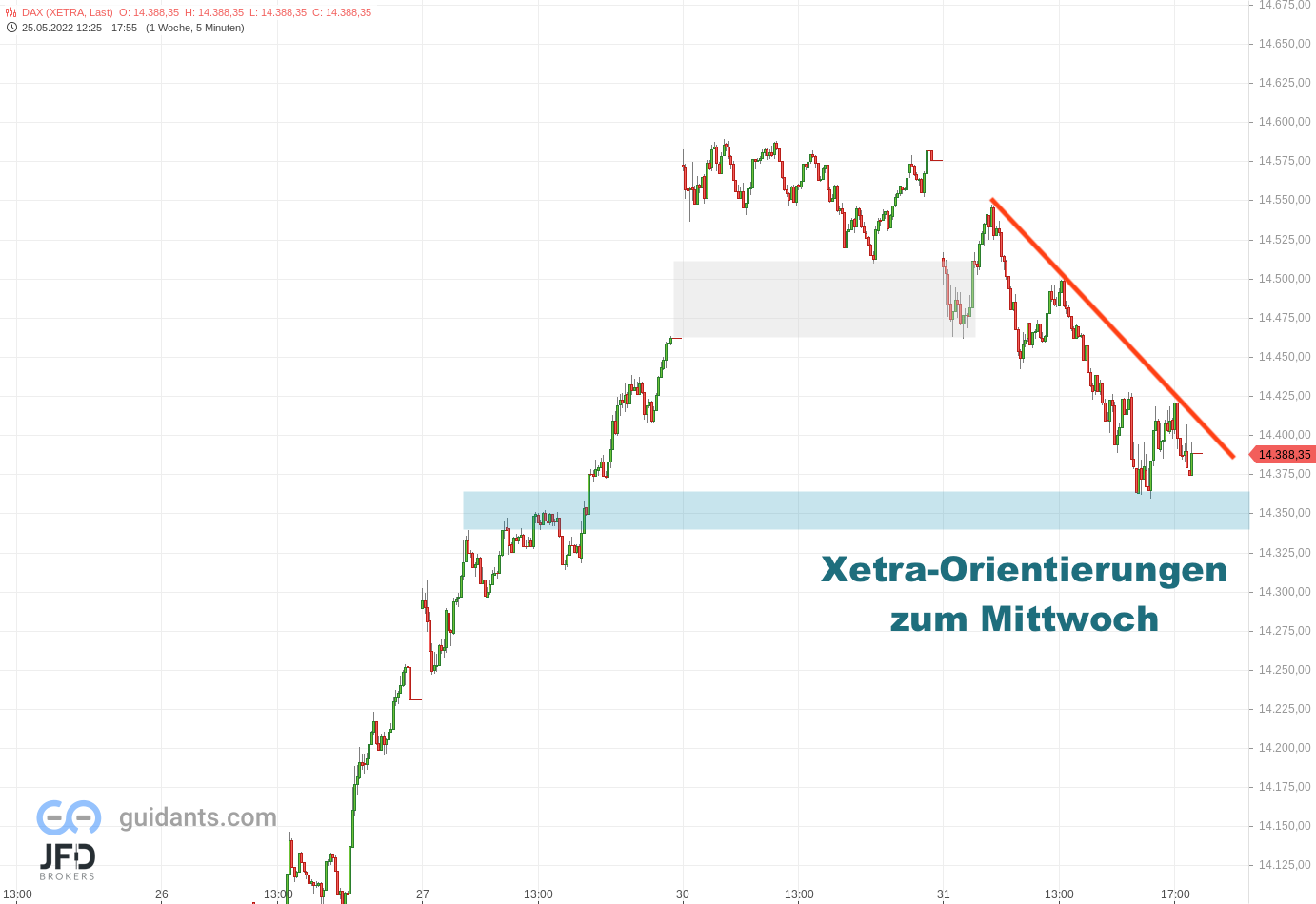 Es fand sich in der ersten Tageshälfte kein Trend. Die 14.500 schien bereits zu weit entfernt, als dass die Marktteilnehmer auch nur einen Versuch unternehmen wollten, die ehemalige obere Gap-Kante noch einmal zurückzuerobern. Auf der Unterseite bremste die 14.400 ein. Auch ein zweiter Versuch auf der Oberseite verlief dann bei 14.489 Punkten im Ende des Impulses.