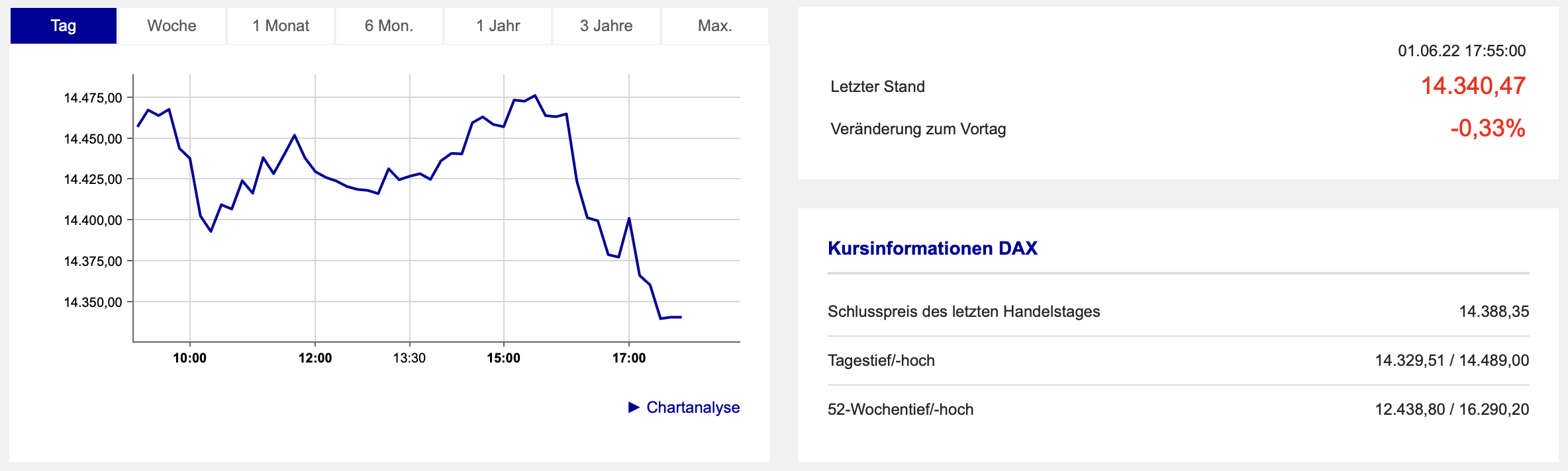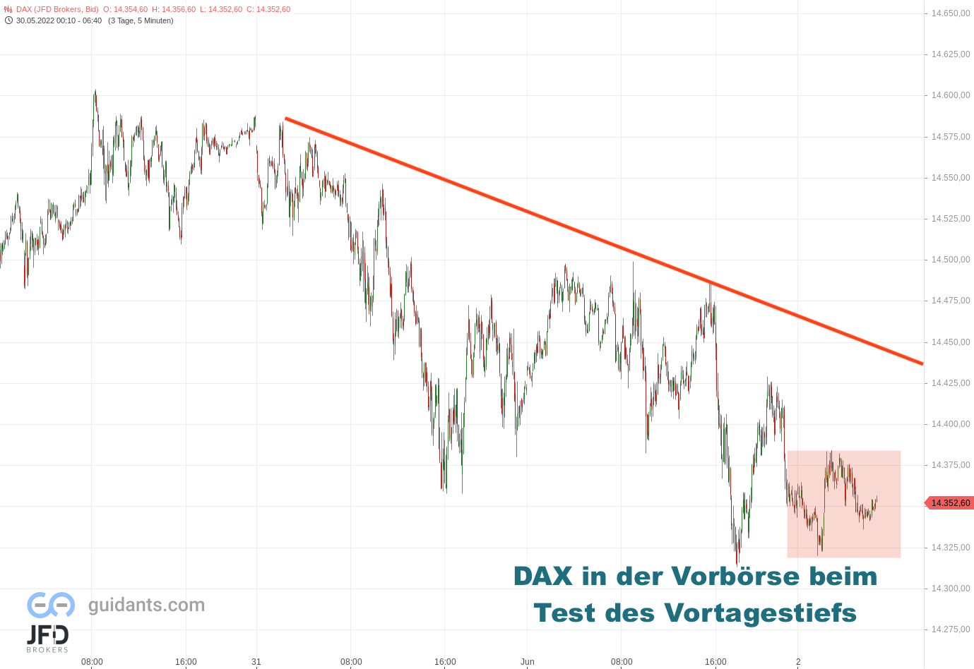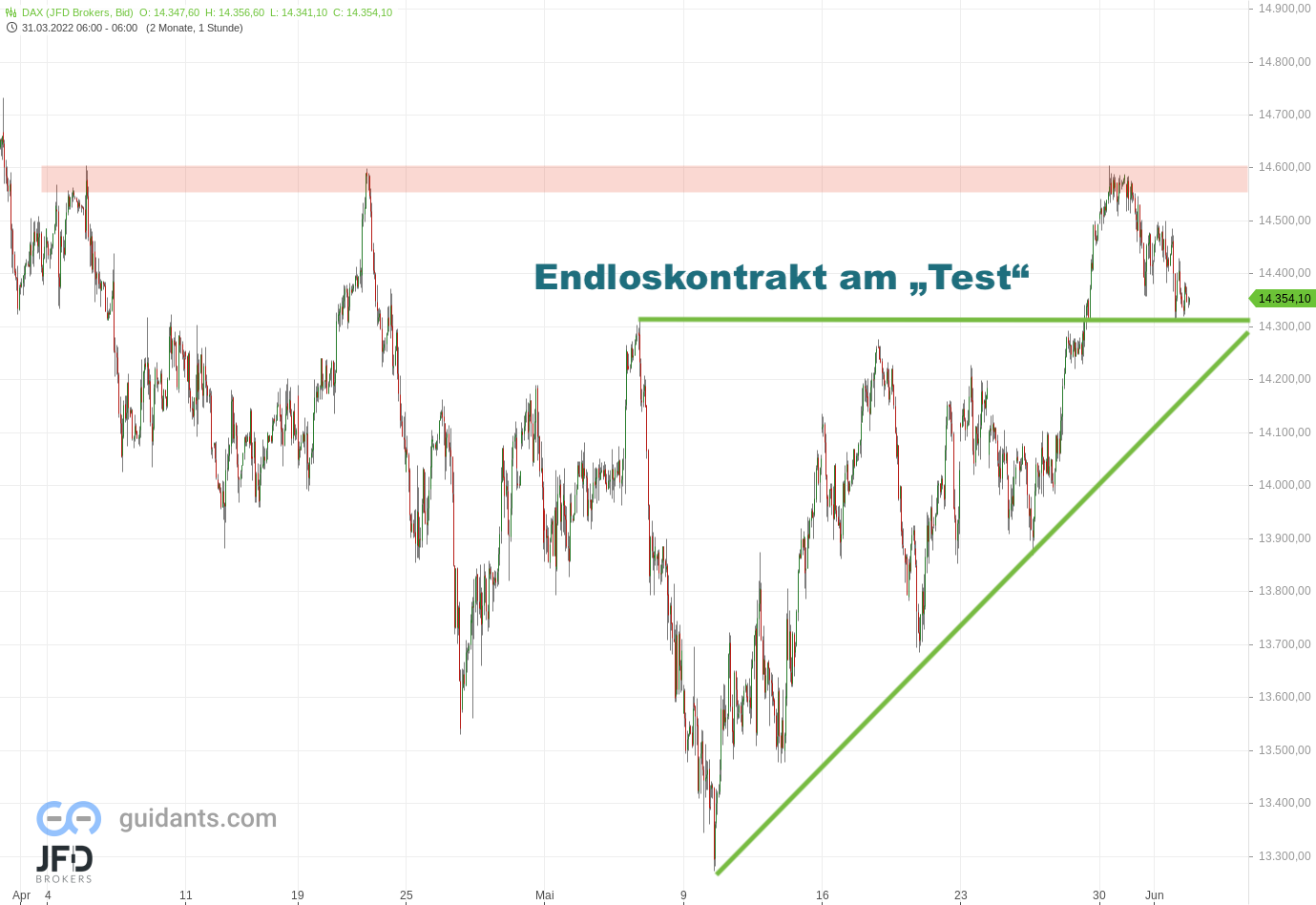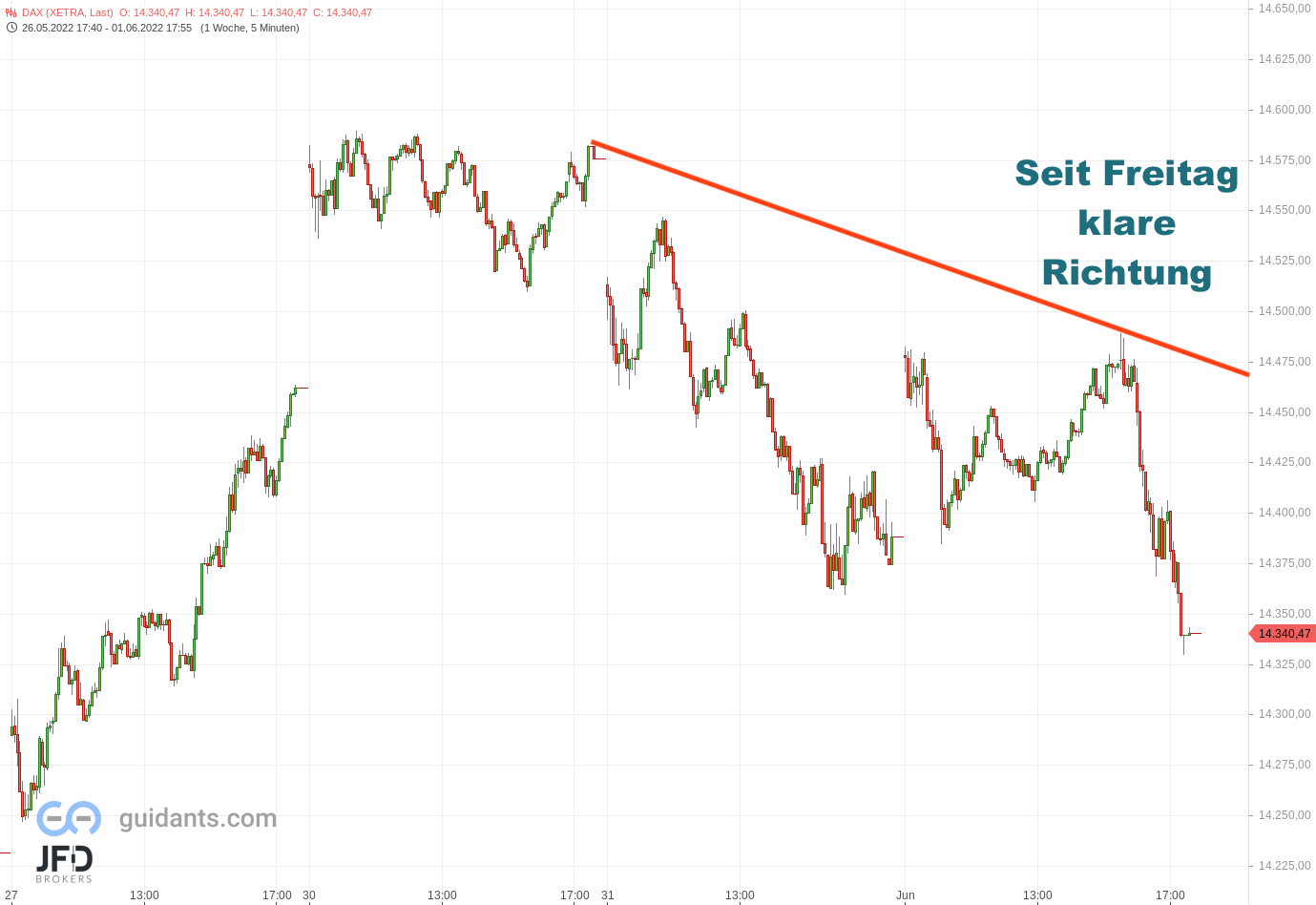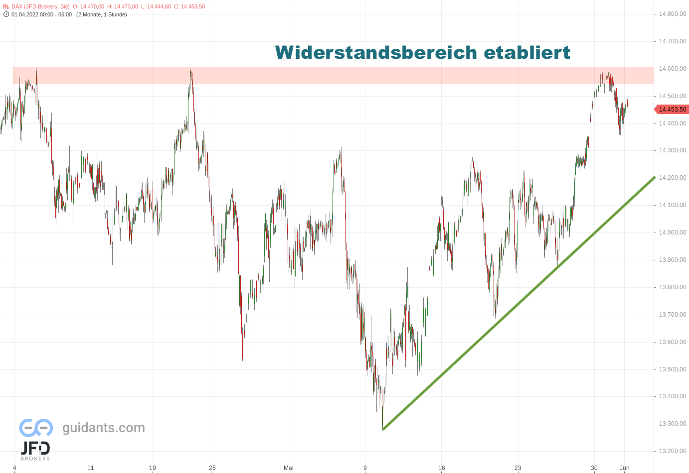 Es lässt sich im mittelfristigen Bild daher heute mit einem Test der Kreuzunterstützung aus Aufwärtstrend und den ehemaligen Mai-Hochs um 14.320 Punkte kalkulieren: