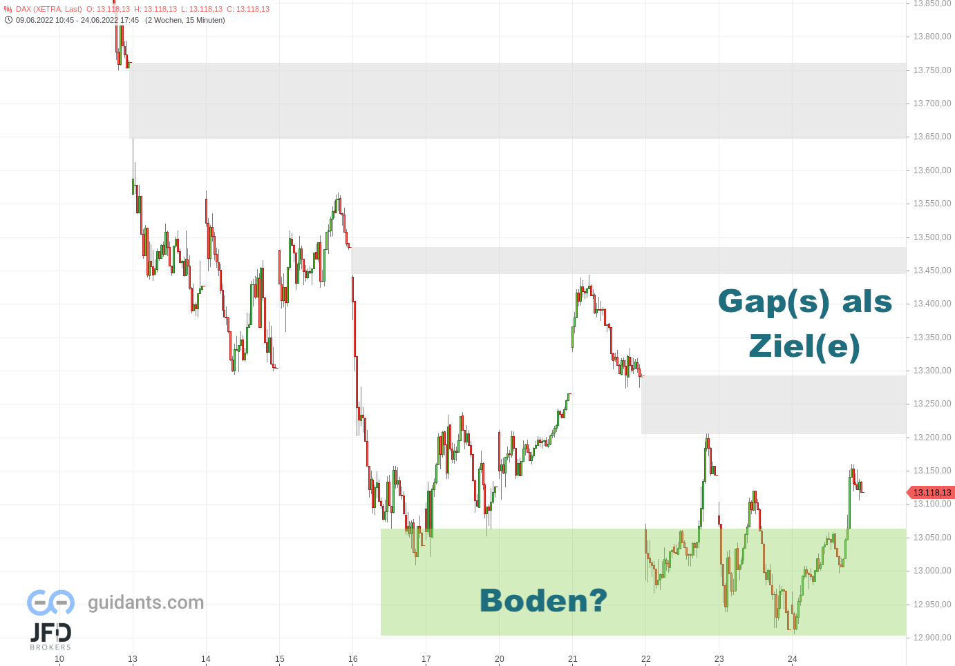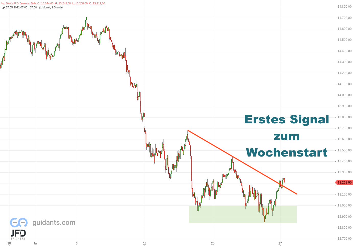 An den bekannten Zielen wie Gaps würde ich zum Wochenstart auch nichts ändern. Es ginge beispielsweise konform mit der Überwindung des jüngsten Abwärtstrends im Xetra-Chartbild bei 13.300 Punkten: