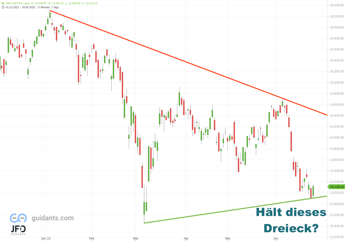 Anleger sind weiter besorgt, dass die Situation am Gasmarkt unsere Wirtschaft stark beeinträchtigt. Technisch ist daher noch kein starker Boden im DAX ausgeprägt. Das im Tageschart skizzierte Dreieck muss erneut angepasst werden: