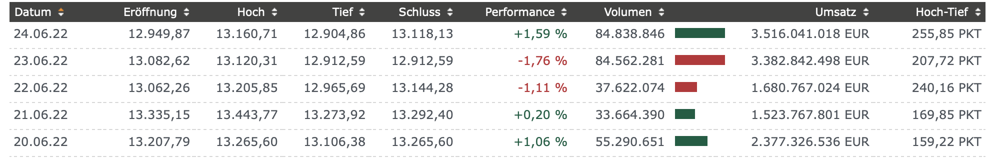 Die letzte Handelswoche konnte wenig Erkenntnisse zu einer klaren Richtung bringen. Ein neues Monatstief aber auch eine schnell Rückeroberung der 13.000 per Schlusskurs waren die Eckdaten, über die wir bereits am Sonntag sprachen. So sah die Woche im Detail aus:
