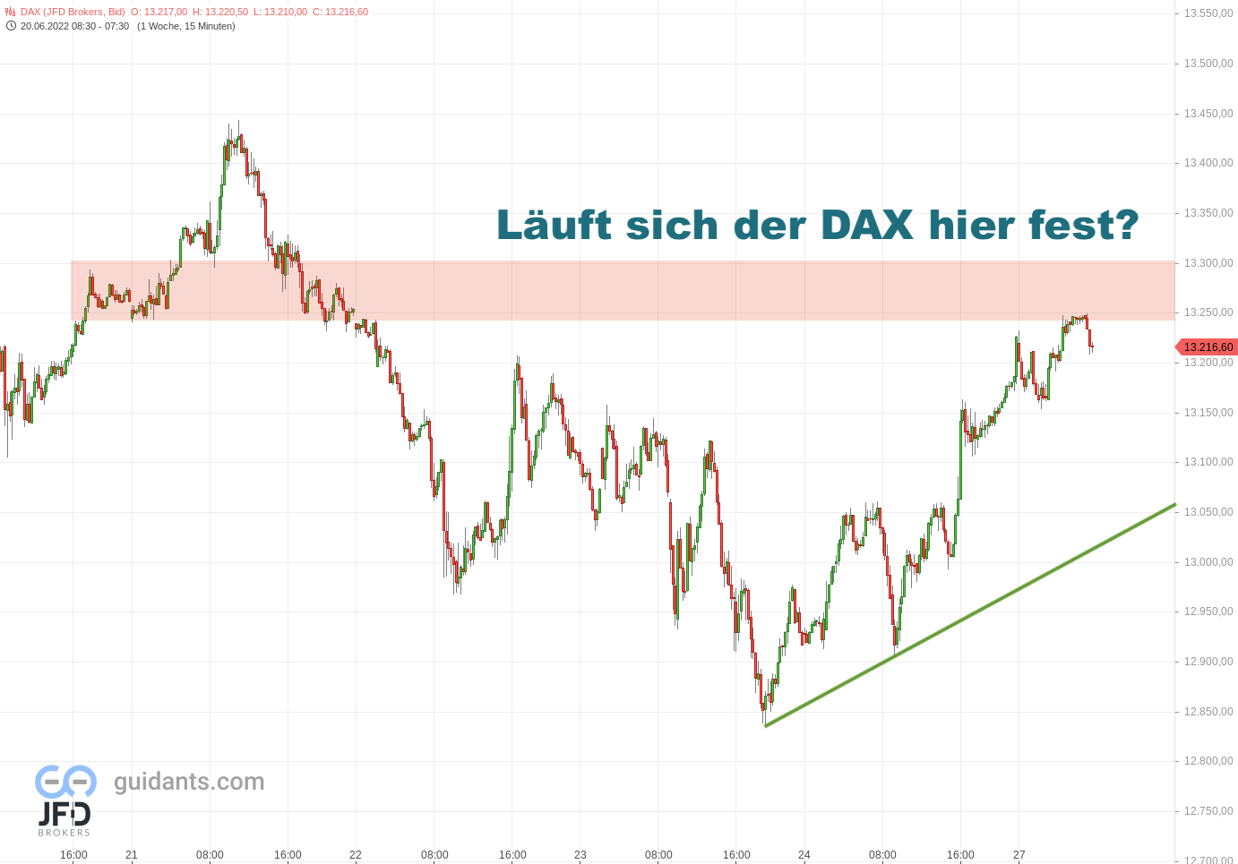 Damit schiebt sich der Index direkt zu der eben skizzierten ersten Widerstandszone, welche um 13.300 Punkte verläuft: