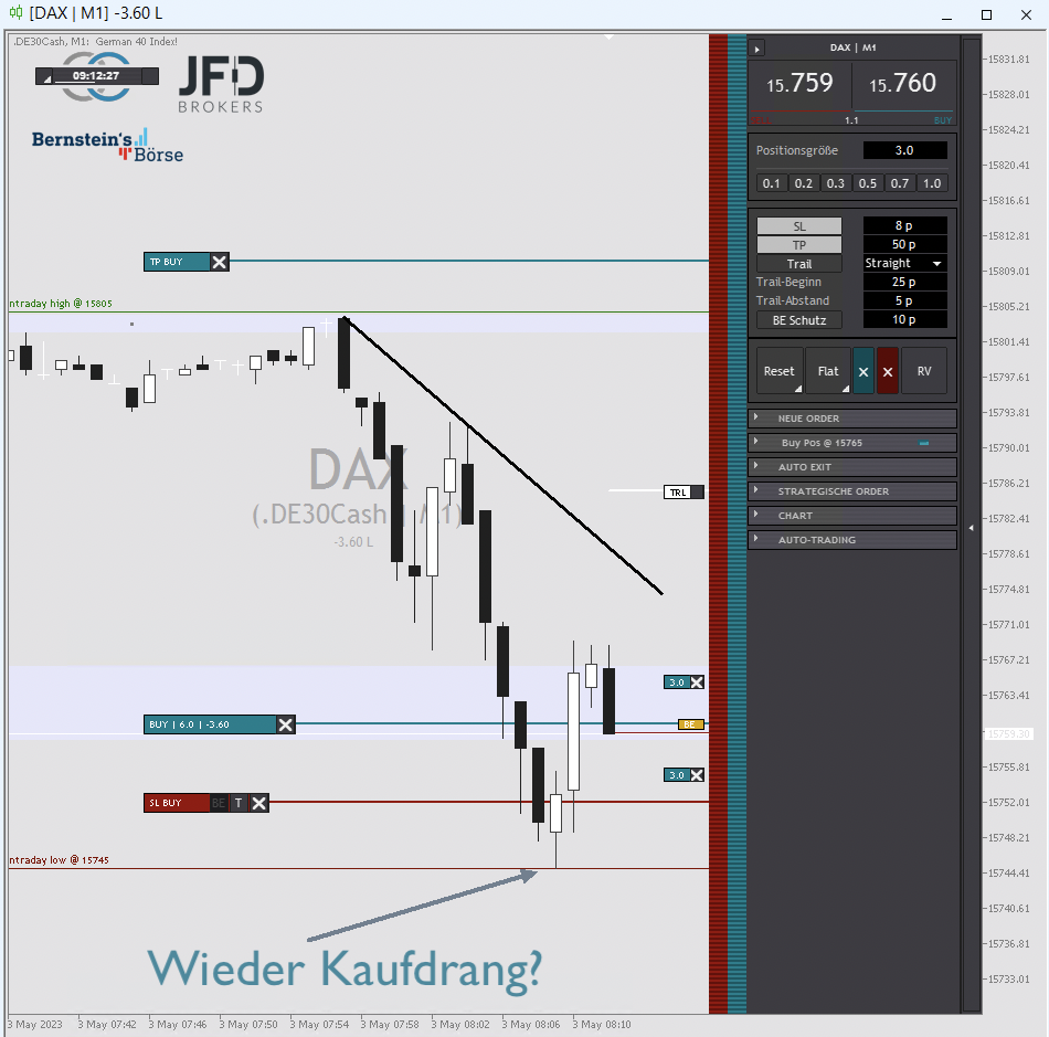 Da im DAX am Dienstag den unteren Bereich seiner Range testete, war am Mittwoch mit der technischen Gegenbewegung zu rechnen. Ausgestaltet hatte ich dies im Livetrading mit dieser Idee am Morgen: