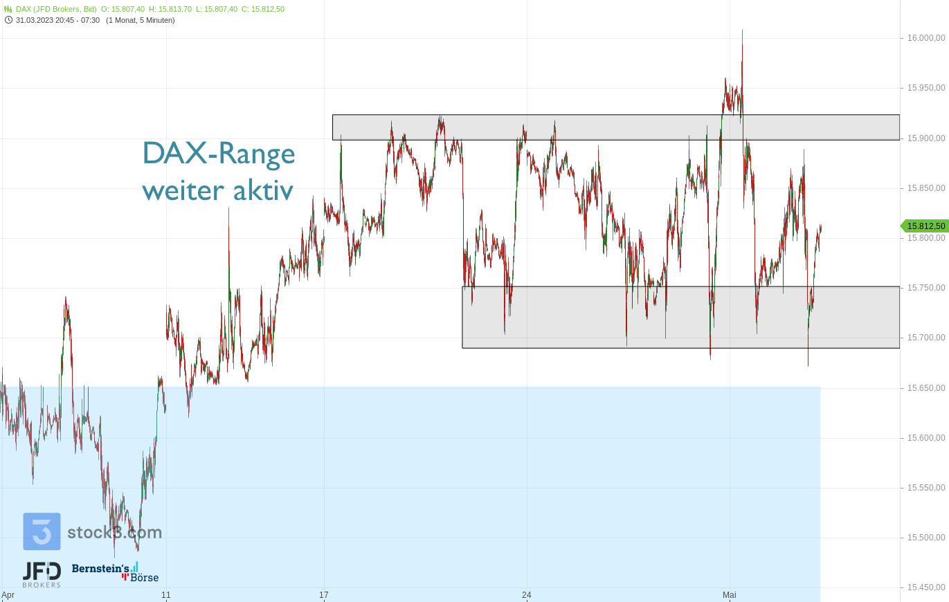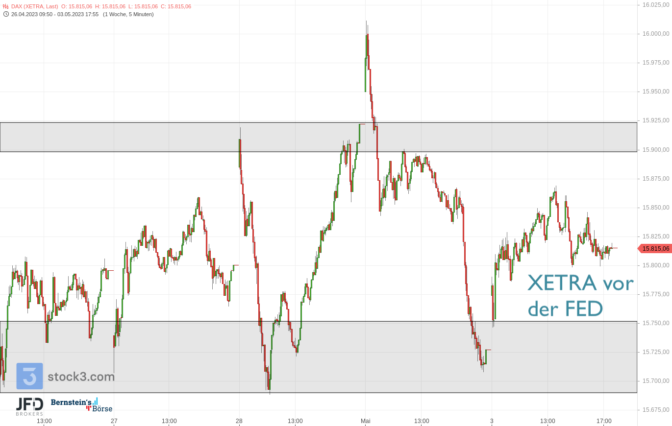 Damit bleibt der Range-Bereich unter 15.920 bis zur 15.700 aktiv, auch wenn wir hier zur Oberseite hin einen Versuch des Durchlaufens gesehen hatten. Im Vorfeld der FED-Sitzung hatten die Marktteilnehmer vorrangig Zurückhaltung geübt. So landeten wir per Schlusskurs genau in der Mitte der Range: