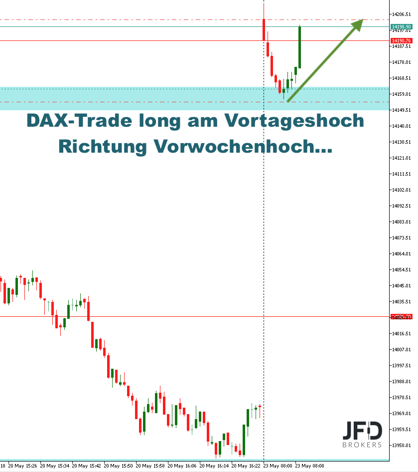 Schon in der Vorbörse stand der Index über 14.200 Punkten und korrigierte zum Xetra-Handelsstart dann zunächst auf das Freitagshoch. Ein Niveau, was mit Blick auf einen potenziellen Ausbruch für mich eine Long-Chance darstellte und auch so gehandelt wurde: