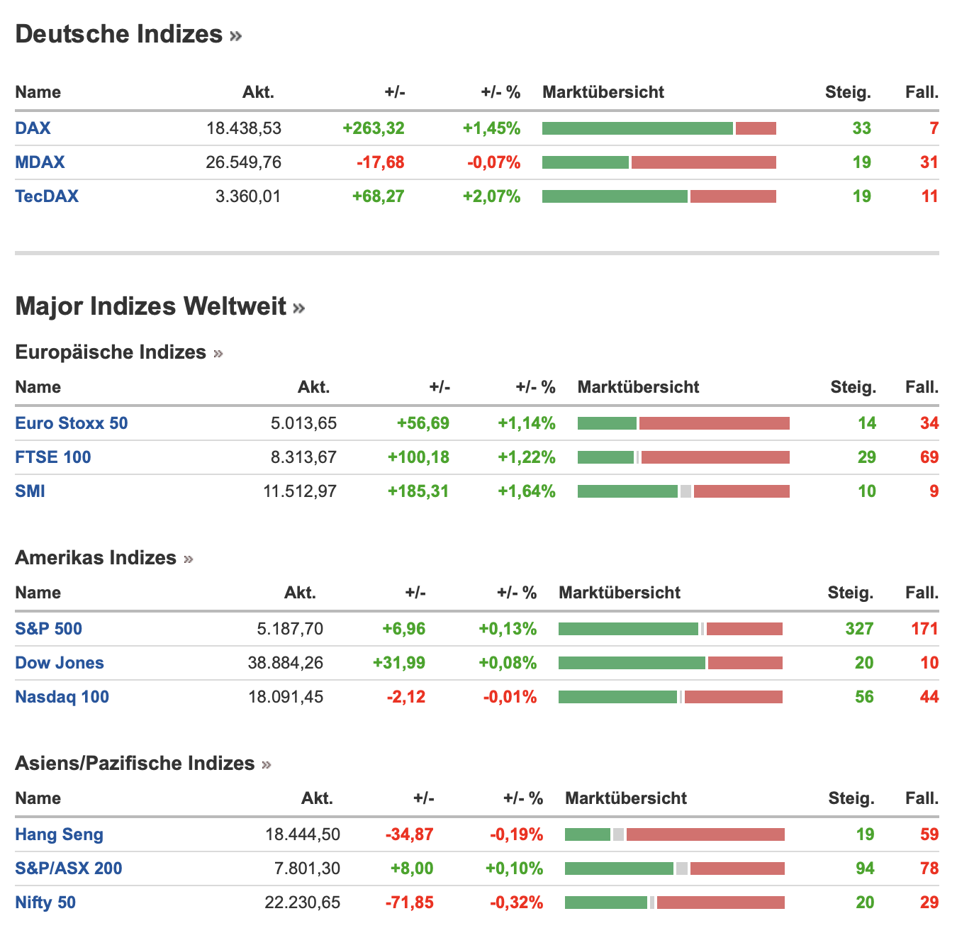 In Summe setzten sich aber auch an der Wall Street die Bullen durch, wenn auch diesmal nur mit leichten Aufschlägen. Als Zusammenfassung aller Indizes inklusive Asien ist diese Übersicht am Morgen hier verankert: